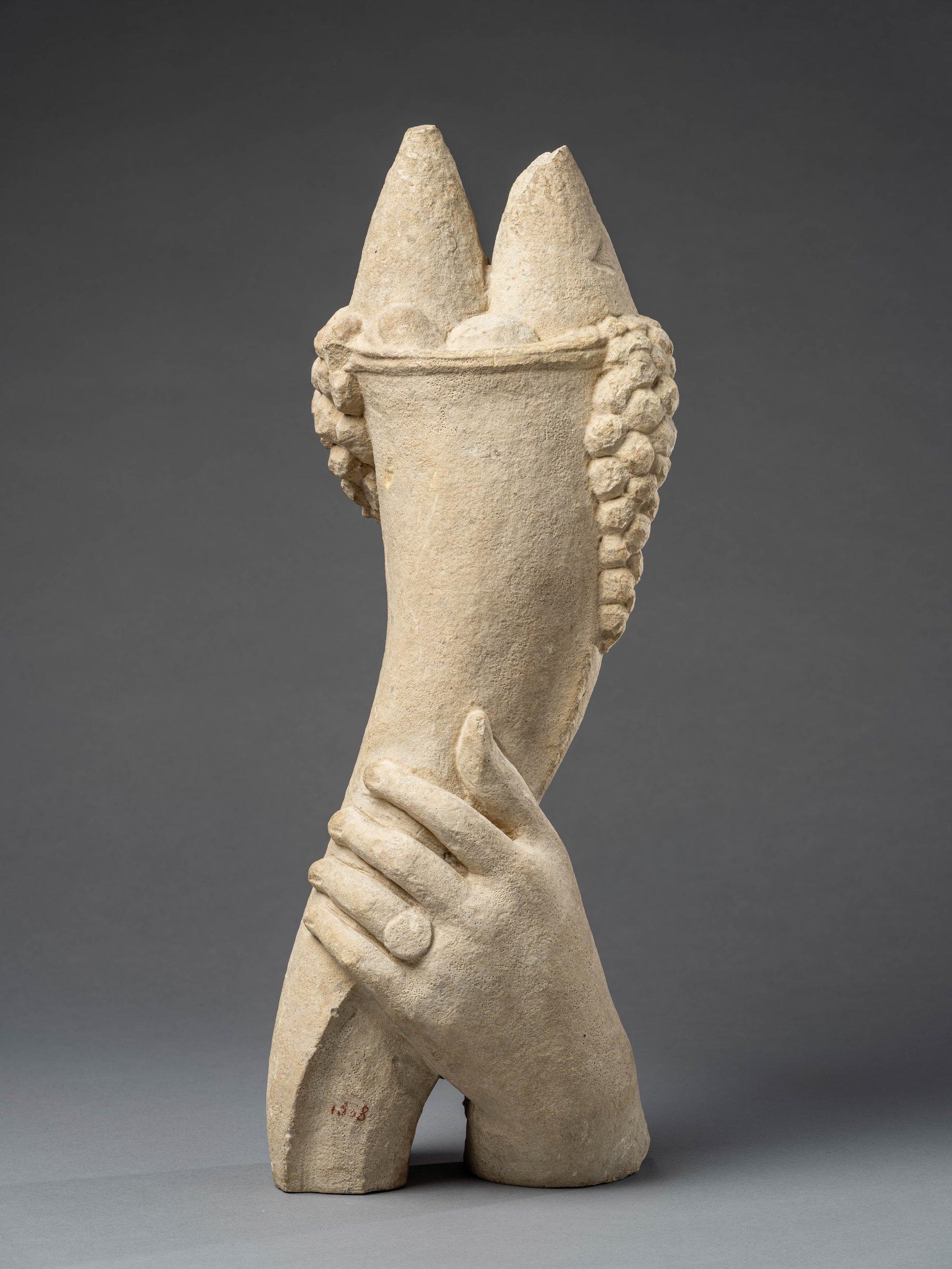 Left hand of a statue holding a double cornucopia filled with grapes and other fruit and wearing a finger ring with oval bezel from the early Hellenistic Period (3rd century BC), Cyprus Courtesy the John and Mable Ringling Museum of Art, Sarasota, Florida
