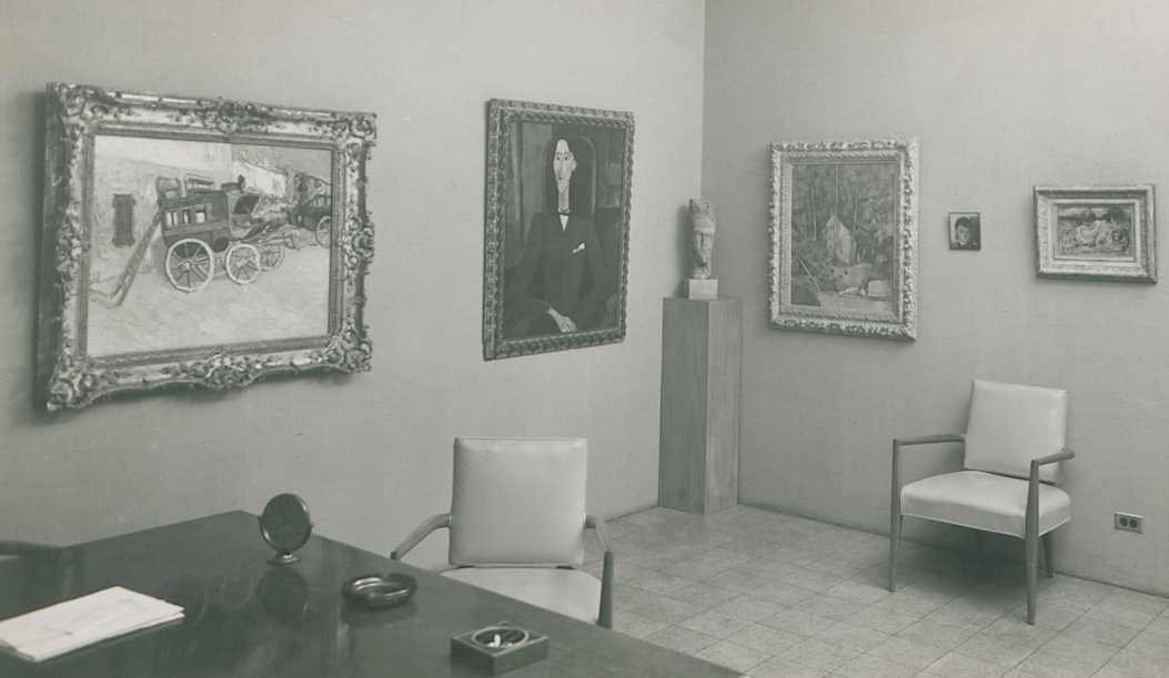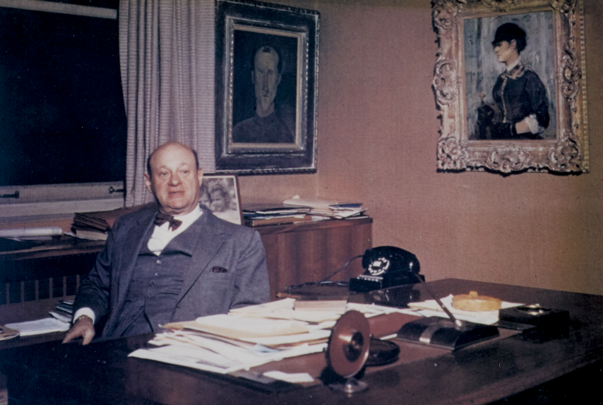 Henry Pearlman in his New York office (1950s), with Modigliani’s Léon Indenbaum (1916) and Edouard Manet’s Young Woman in a round Hat (1877-78)