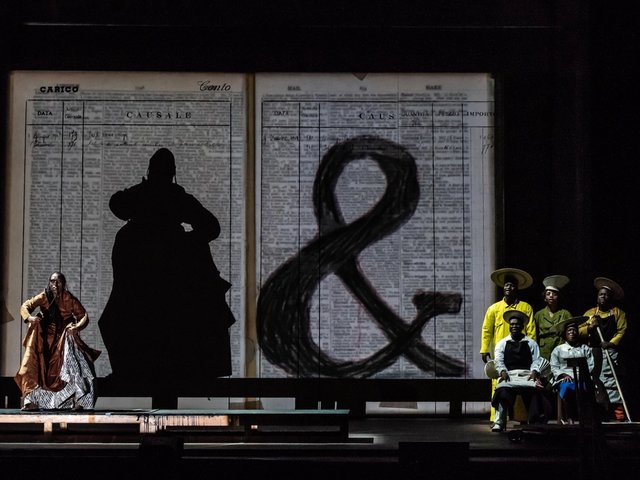 The set is inspired by his 2006 sculpture Map of China. Here, it becomes a map of the world with the continents at different heights. (Ai was thinking of the masses as exiles and migrants huddled on the lower levels.) Meanwhile, the hats of the nobility reflect different animals in the Chinese zodiac, echoing Ai’s use of the symbols in his installation Circle of Animals/Zodiac Heads (2010) as well as his 2024 book Zodiac: A Graphic Memoir. Some of Ai’s drawings and photographs are reproduced on costumes and props—including the famous hand giving the middle finger.