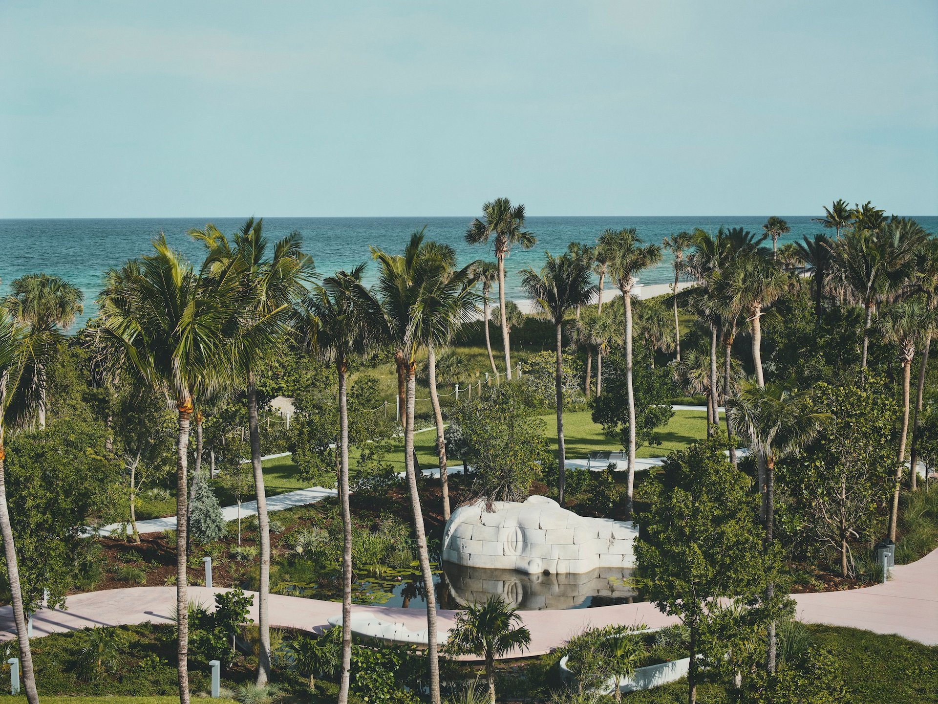 “I was inspired by the history of monumental sculpture, like Olmec heads and images of the Statue of Liberty, where you see just a piece of the head,” says the French-born artist, who works between New York and Paris. The interaction between the work and its garden is a collaboration with the Miami-based landscape architect Raymond Jungles. “There is something very poetic in the symbol of water and with the Coast Guard,” Nourry says. “It’s all about that fine line between the lands and the sea.”