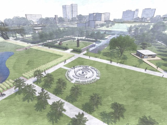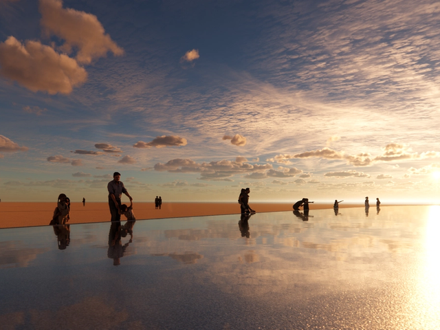 “We envisioned a piece that would feel like a ruin overtaken by nature, with mangrove roots climbing over it,” says Jungles, the landscape architect. “Having a sculpture and water garden on a public beach is rare, and here they come together beautifully. The water mirrors the sky and landscape, completing the sculpture’s face and creating a place where anyone can pause and find something special.”