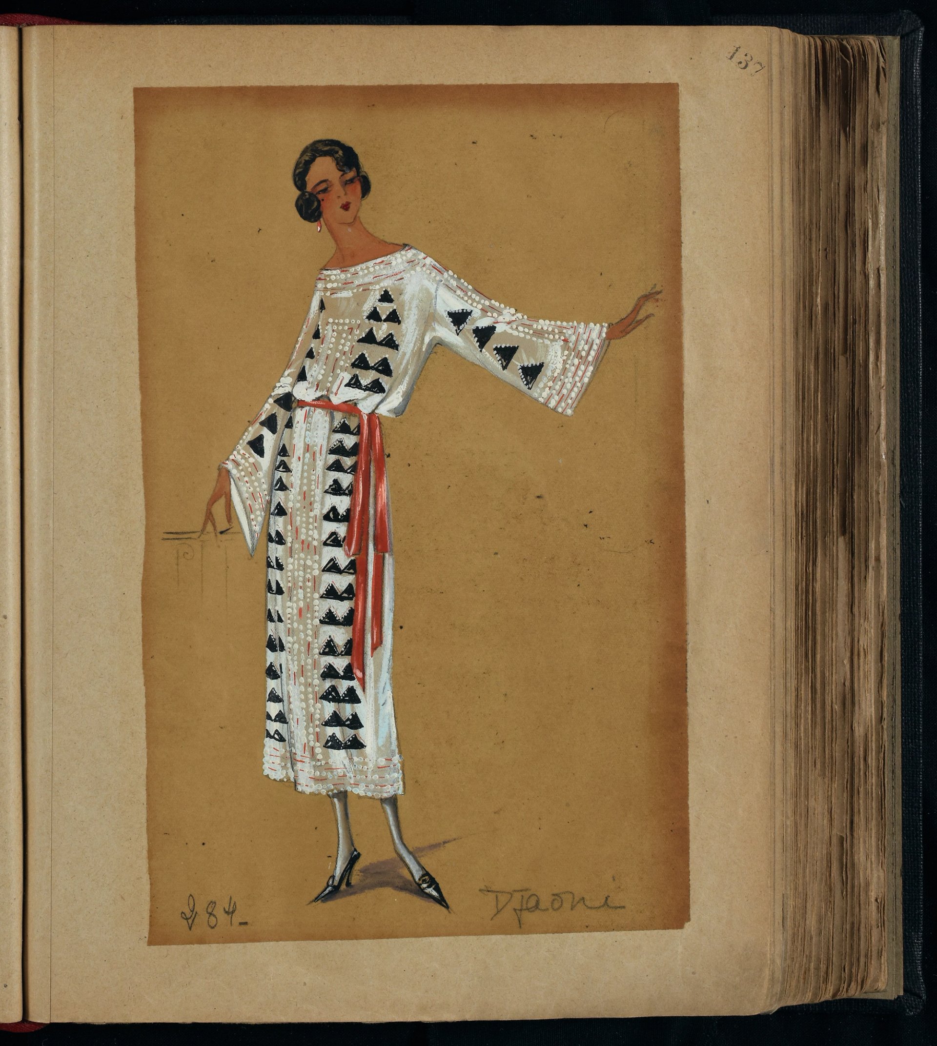 An illustration, created by an in-house artist, for an outfit called Djaoni by Jeanne Lanvin from 1920. The chiffon fabric of the dress is embellished with fine strips of gilded leather and beading © Lanvin Heritage