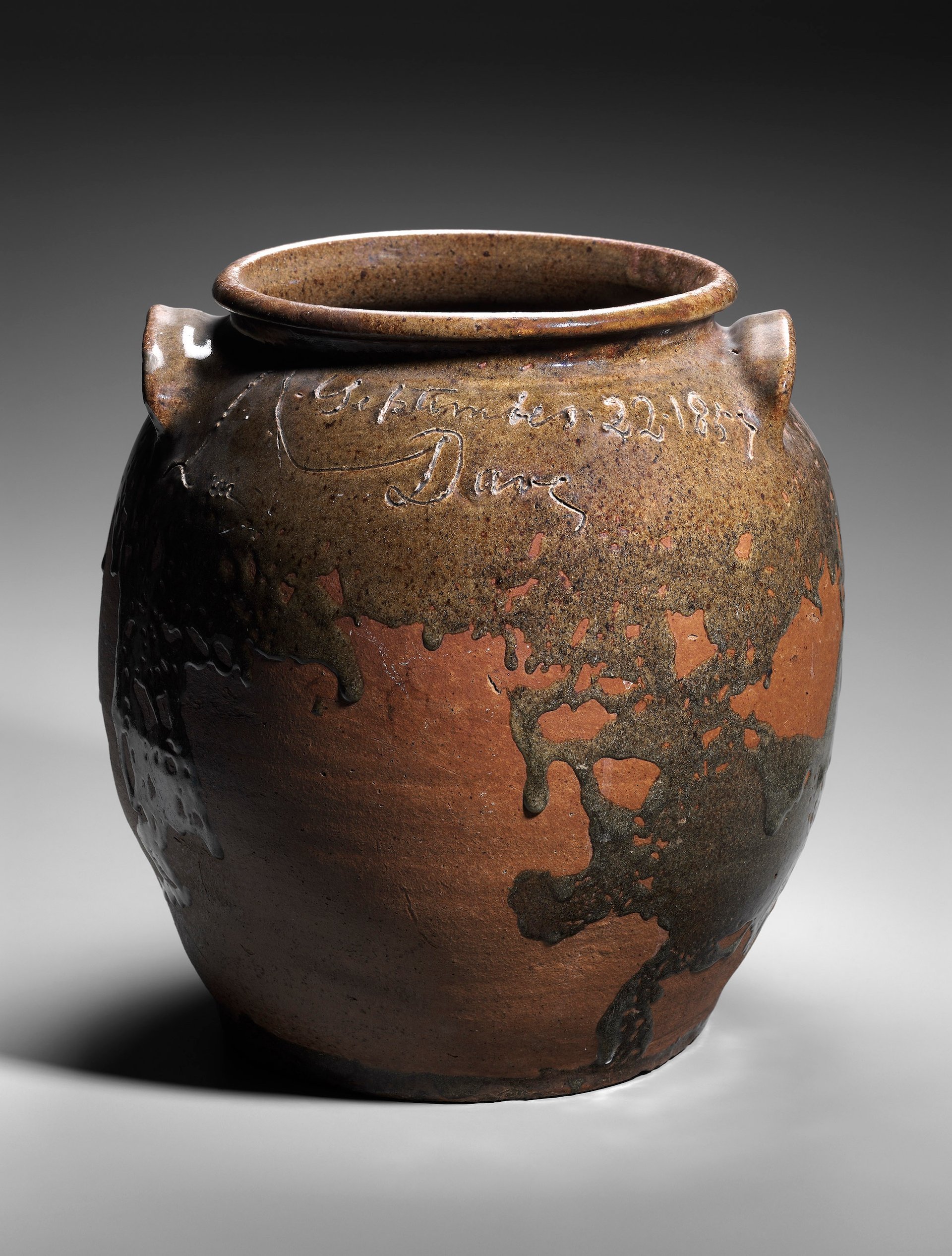 Another jar made the same year, 1857, has a particularly wrenching inscription in light of Drake’s forced separation from a woman believed to be his wife and her two sons. That vessel, at the Greenville County Museum of Art, reads: “I wonder where is all my relation.”