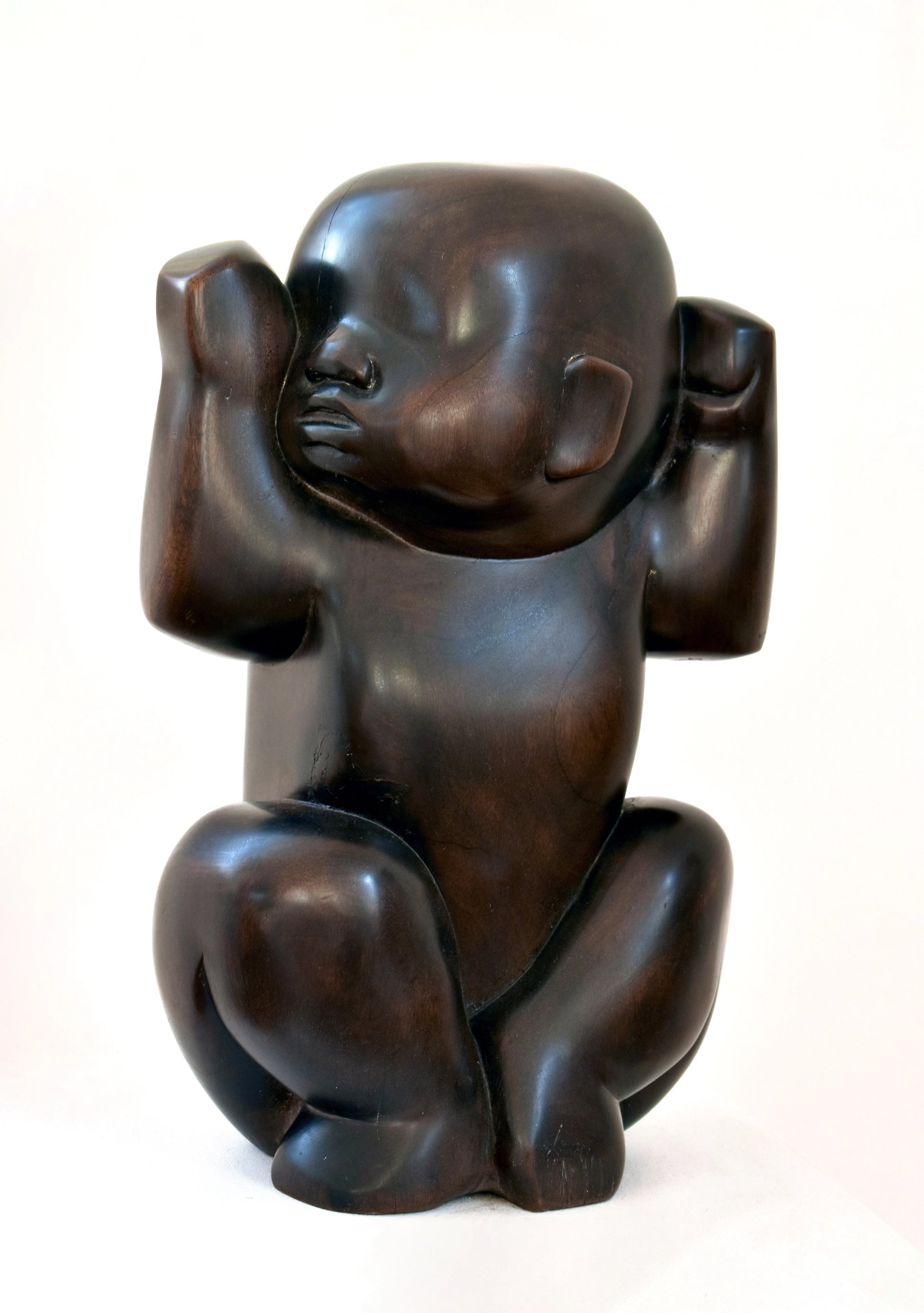 Hepworth was a proponent of direct carving, the practice of carving directly into the wood or stone. She favoured hard woods, like the Burmese wood used for Infant, which was very difficult to carve. Reviews of her early exhibitions in the 1920s particularly praise her technical ability, and the sympathetic dialogue between organic material and the forms she created. Infant was made after the birth of her first son, Paul Skeaping, which she described as “a wonderfully happy time … with him in his cot, or on a rug at my feet, my carving developed and strengthened”.