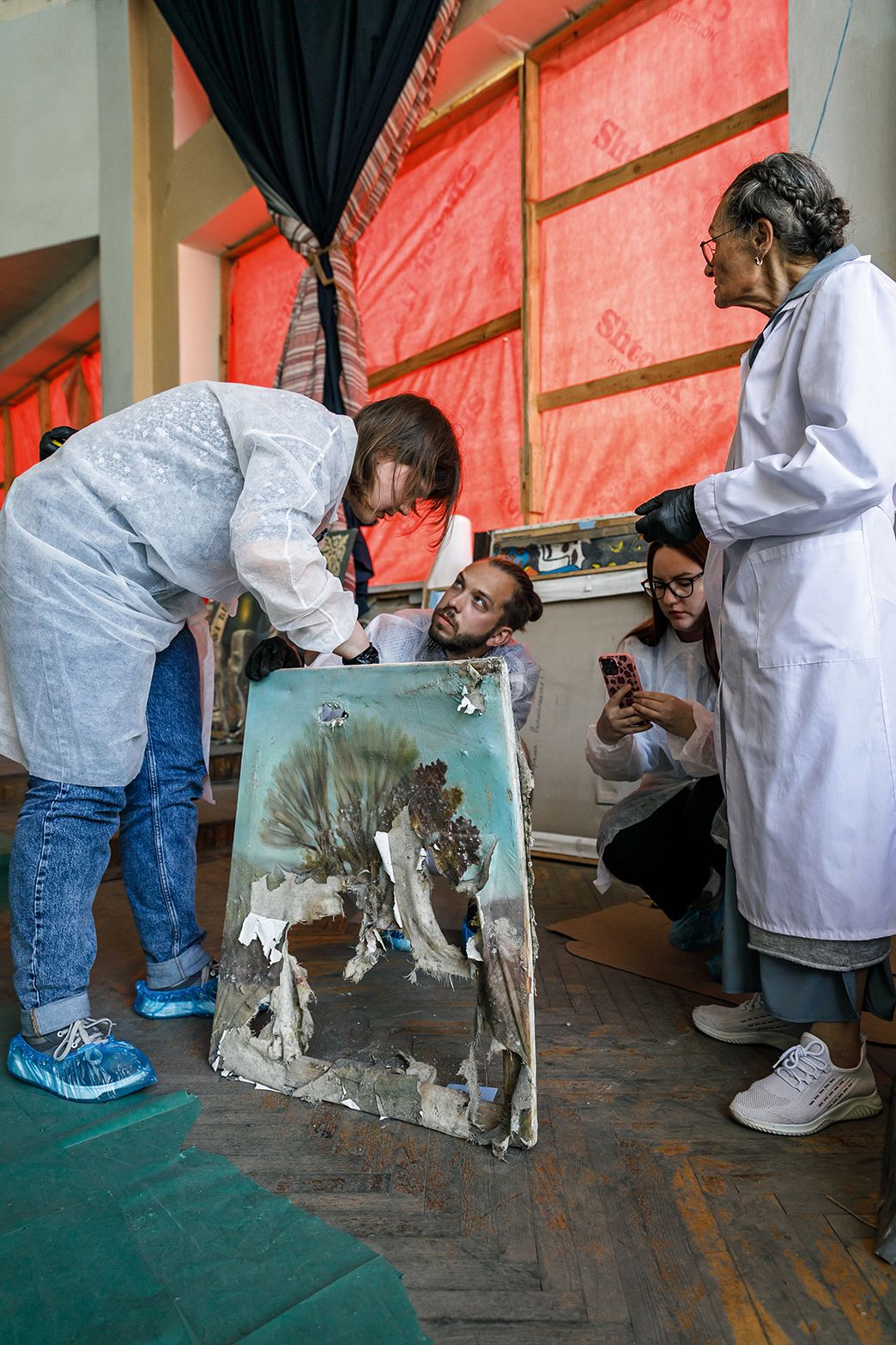 Workers assess a damaged painting recovered from the bombed Boychuk Academy