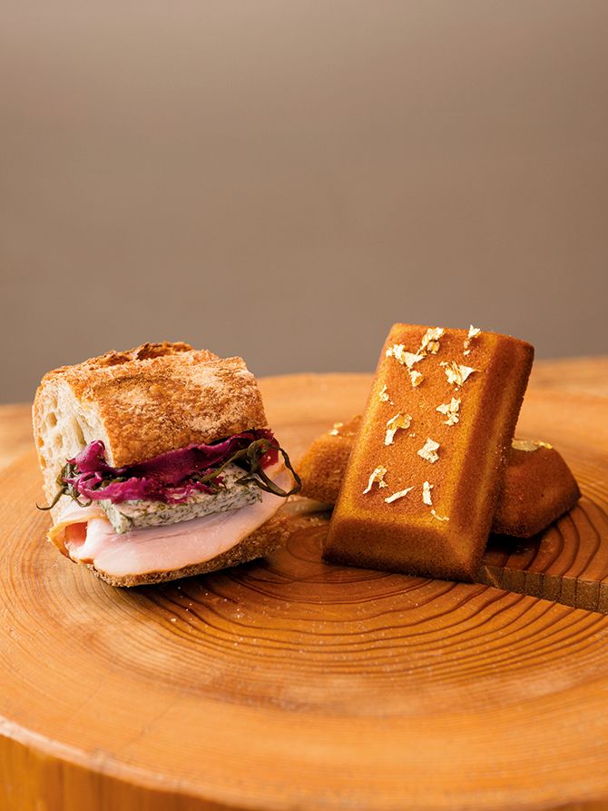 Namae’s unique takes on French flavours at the AWT Bar include a jambon-beurre (left) with Okinawan ham and aromatic seaweed, while his financier cake (right) is sprinkled with gold leaf