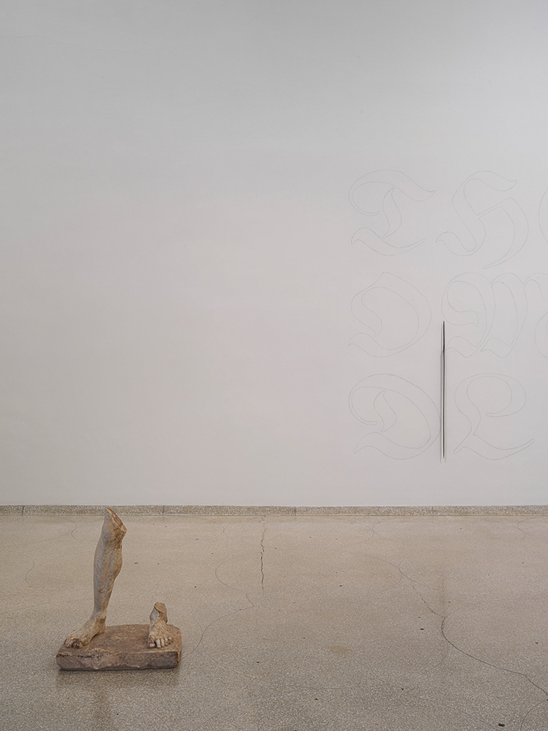 Vietnamese artist Danh Võ’s work Take My Breath Away resuscitates a second-century Roman sculpture that was once a male statue—a god, a statesman, or perhaps a poet—and is now reduced to just two feet standing slightly apart on a pedestal, one of which extends to an ankle and the other to a calf, broken just above the knee. This ancient fragment has a metal brace around its marble ankle; as in Japanese kintsugi ceramic techniques, the damage is incorporated into the repair, not disguised. Võ’s work wears absence proudly, and he makes it even more palpable by borrowing the title from the Los Angeles synth-pop band Berlin’s biggest (and last) hit, released in 1986. Forever associated with the jingoistic Hollywood blockbuster of the same year, Top Gun, Take My Breath Away is about innuendos, “thoughts unsaid, then forgotten”, to borrow a phrase from a work by Bas Jan Ader.