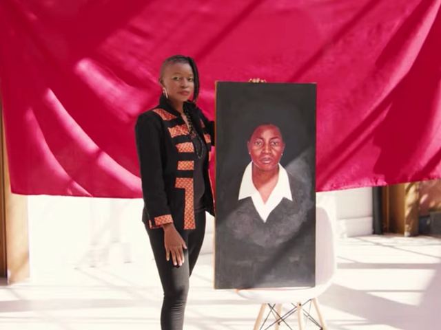 Lagos artist Nengi Omuku with her 2024 exhibition The Dance of People and the Natural World at Arnolfini, Bristol © Nengi Omuku 2025; Photo: Lisa Whiting.