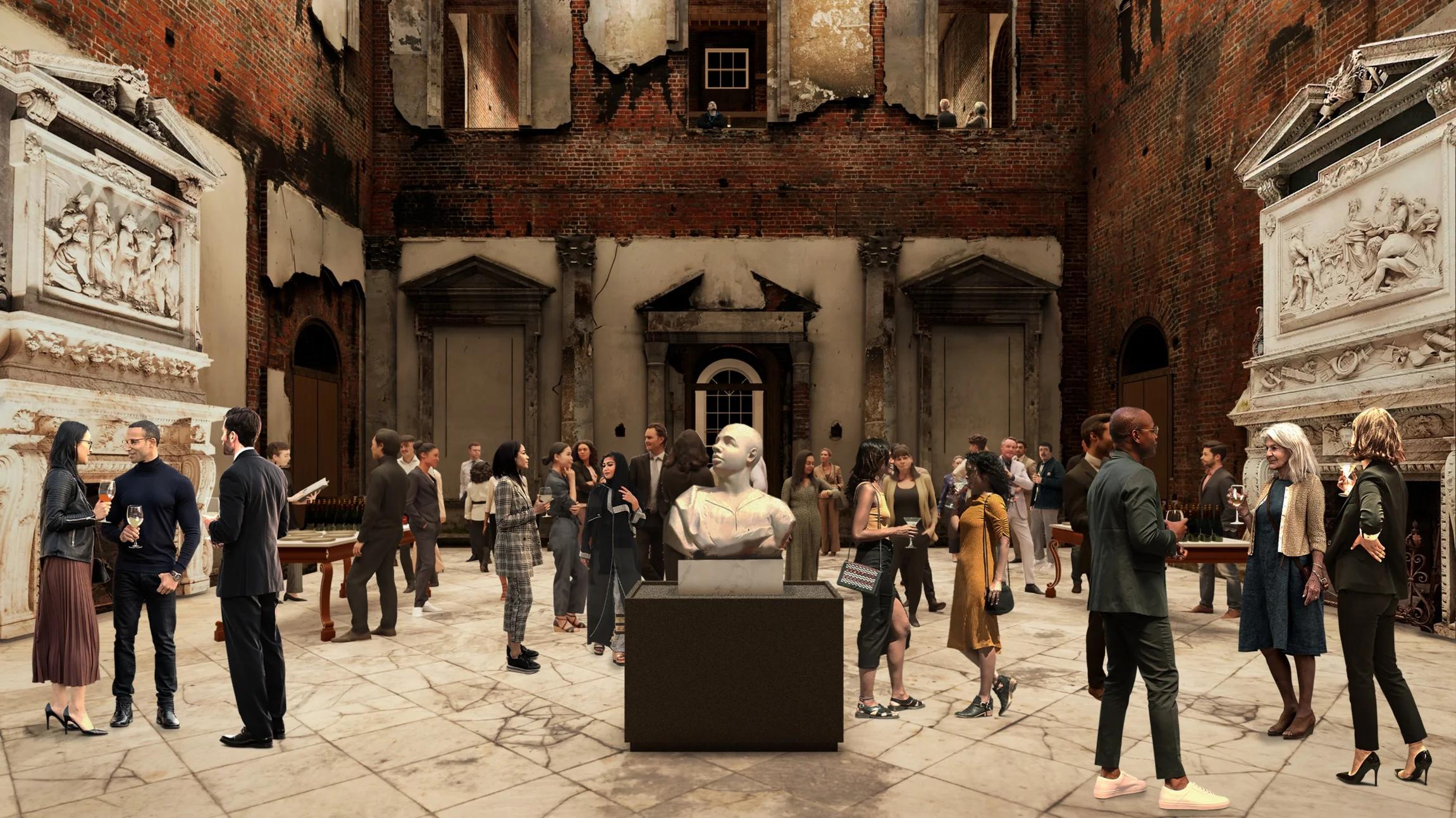 Architect’s impression of an evening community event in the Marble Hall at Clandon Park, Surrey © National Trust Images / Allies and Morrison