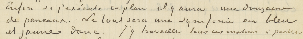 Extract from Vincent’s letter to Theo, 21-22 August 1888, in which he refers to “une symfonie en bleu et jaune” (a symphony in blue and yellow)