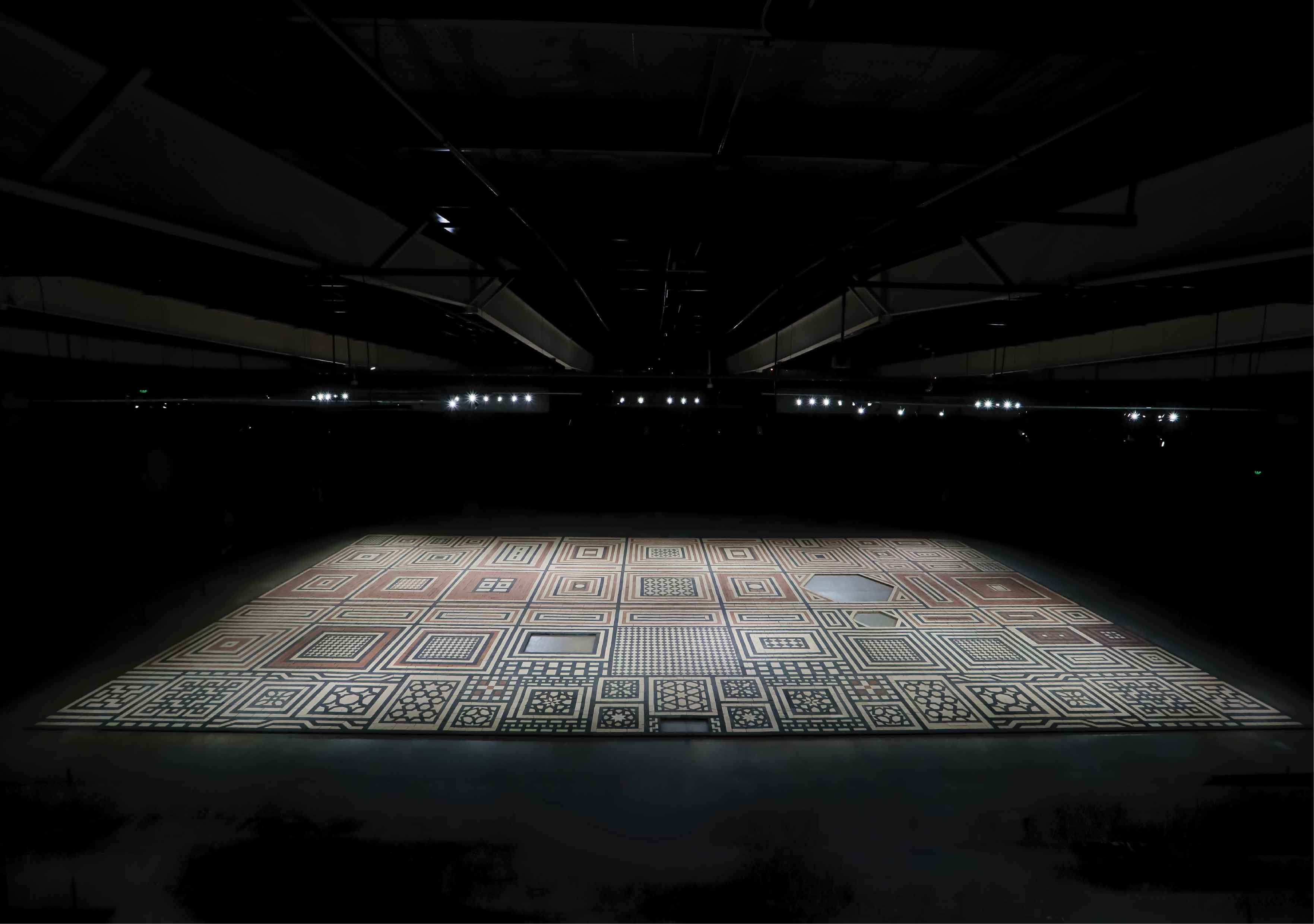 Standing by the ruins (2025) was the second work of this type that she has made; at the first Diriyah Biennale, in Riyadh in 2021, she re-staged the tiled pattern of the Grand Mosque of Aleppo, which suffered extensive damage in the Syrian Civil War. For both pieces, Awartani worked with traditional mud-brick makers in Saudi Arabia, asking them to omit the hay that typically binds the bricks together so that cracks form throughout the pattern, emphasising the vulnerability of the sites.