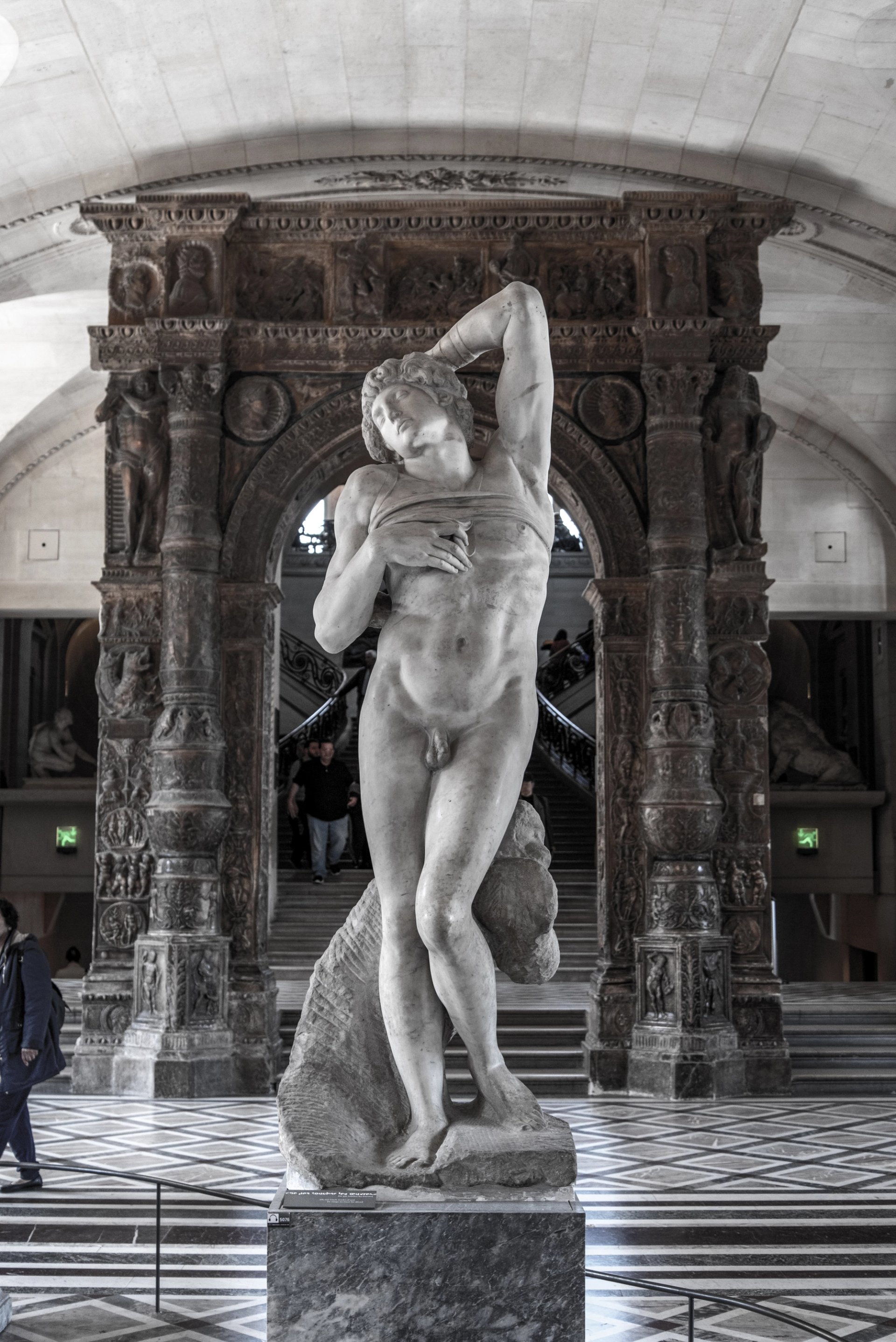 Originally commissioned in 1505 for the tomb of Pope Julius II and completed just after his death in 1513, this seven-foot masterpiece reached France by the middle of the 16th century. After bouncing around a number of noblemen's chateaux, it finally reached the Louvre in 1794. Recalling the dynamic suffering of Hellenistic sculpture, it can also seem to anticipate the later Baroque innovation of pairing ecstasy with death. And it has few rivals in its depiction of male beauty—save, perhaps, the artist's own David, created a decade earlier.