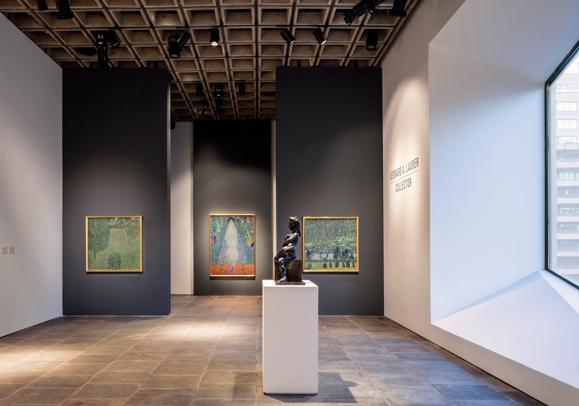 Sotheby’s fourth-floor Breuer galleries, featuring (left to right) Gustav Klimt’s Blooming Meadow (Blumenwiese), Portrait of Elisabeth Lederer (Bildnis Elisabeth Lederer) and Waldabhang bei Unterach am Attersee (Forest Slope in Unterach on the Attersee), from the Leonard A. Lauder collection Photograph by Stefan Ruiz. Courtesy of Sotheby's