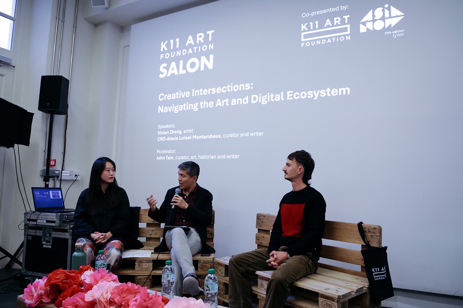 The artist Vivien Zhang (left) in coversation with the curator and writer Alexis Loisel-Montambaux (right, one of the curatorial duo CRO), moderated by the curator, art historian and writer John Tain, at a K11 Art Foundation Salon in Paris, October 2025 Courtesy K11 Art Foundation