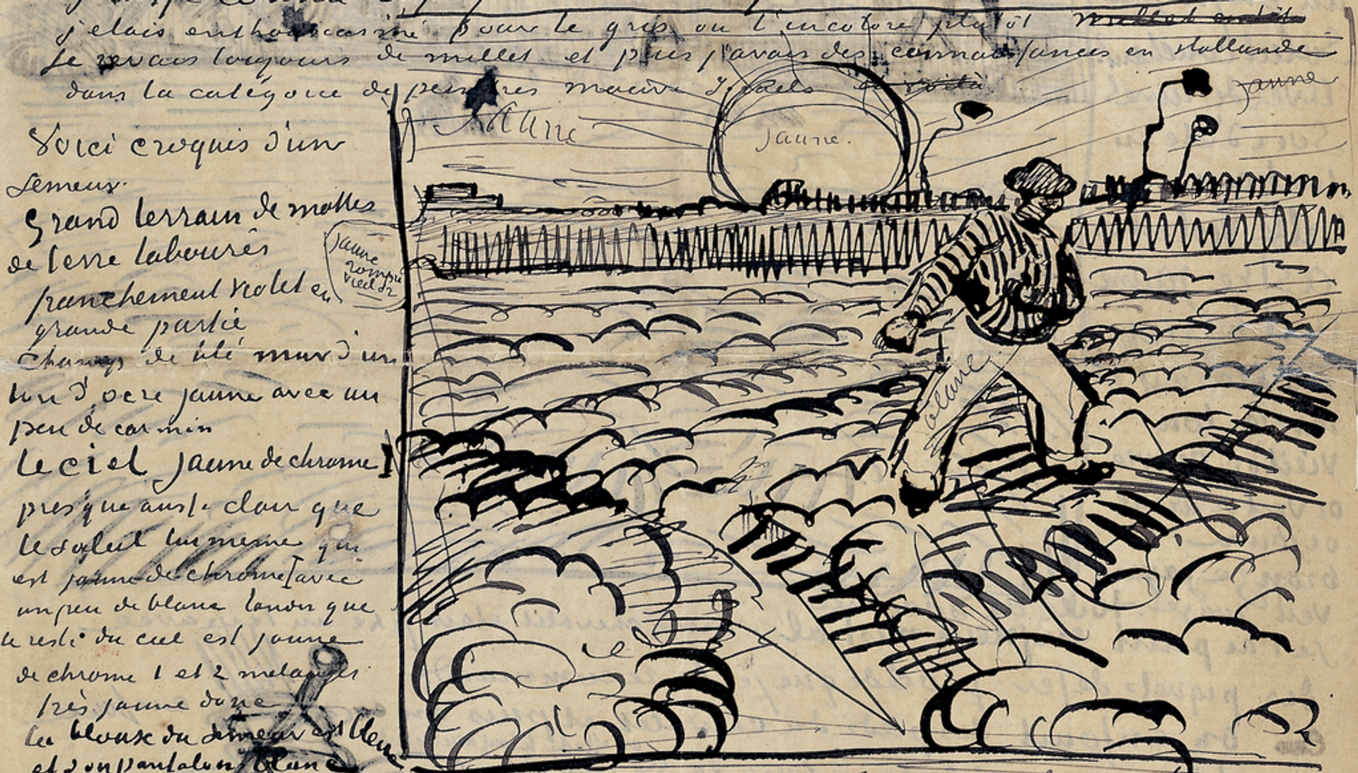 In his letter to Bernard, Van Gogh incorporated a rough sketch of the painting. On it he added some colour annotations, such a “jaune” (yellow) for the sun. Over the next few weeks Van Gogh reworked the painting and then made the more finished drawing for Bernard—the work now coming up at Sotheby’s.