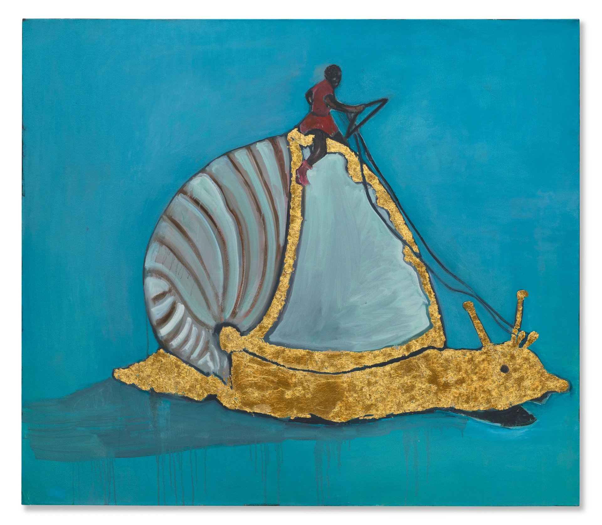 In a category of his own, the late Los Angeles figurative artist Noah Davis’s Snail Pace (2010) depicting the small figure of a black man riding the back of a giant snail encased in its nautilus shell and reprised in canvas and gold leaf, styled after Jeremias Ritter’s 17th-century wunderkammer objet “Snail with Nautilus Shell”. Davis's snail journeyed to $1.1m ($1.3m with fees), leaving a trail of painterly slime in it wake.