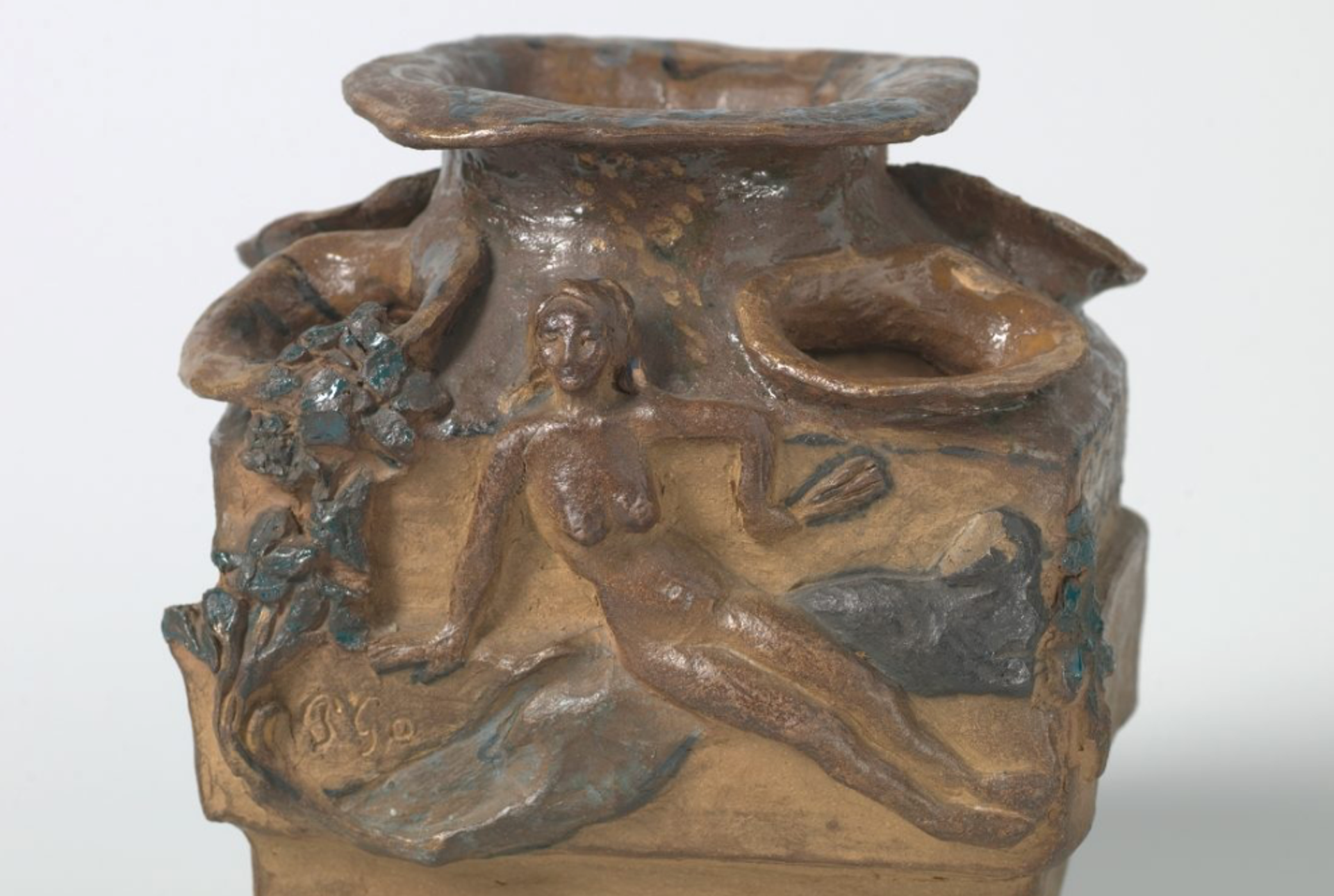 The front of Gauguin’s Cleopatra Pot, with a reclining figure representing the Egyptian queen, behind her (on the right side) a black sheep and with the PGo signature Van Gogh Museum, Amsterdam (Vincent van Gogh Foundation)
