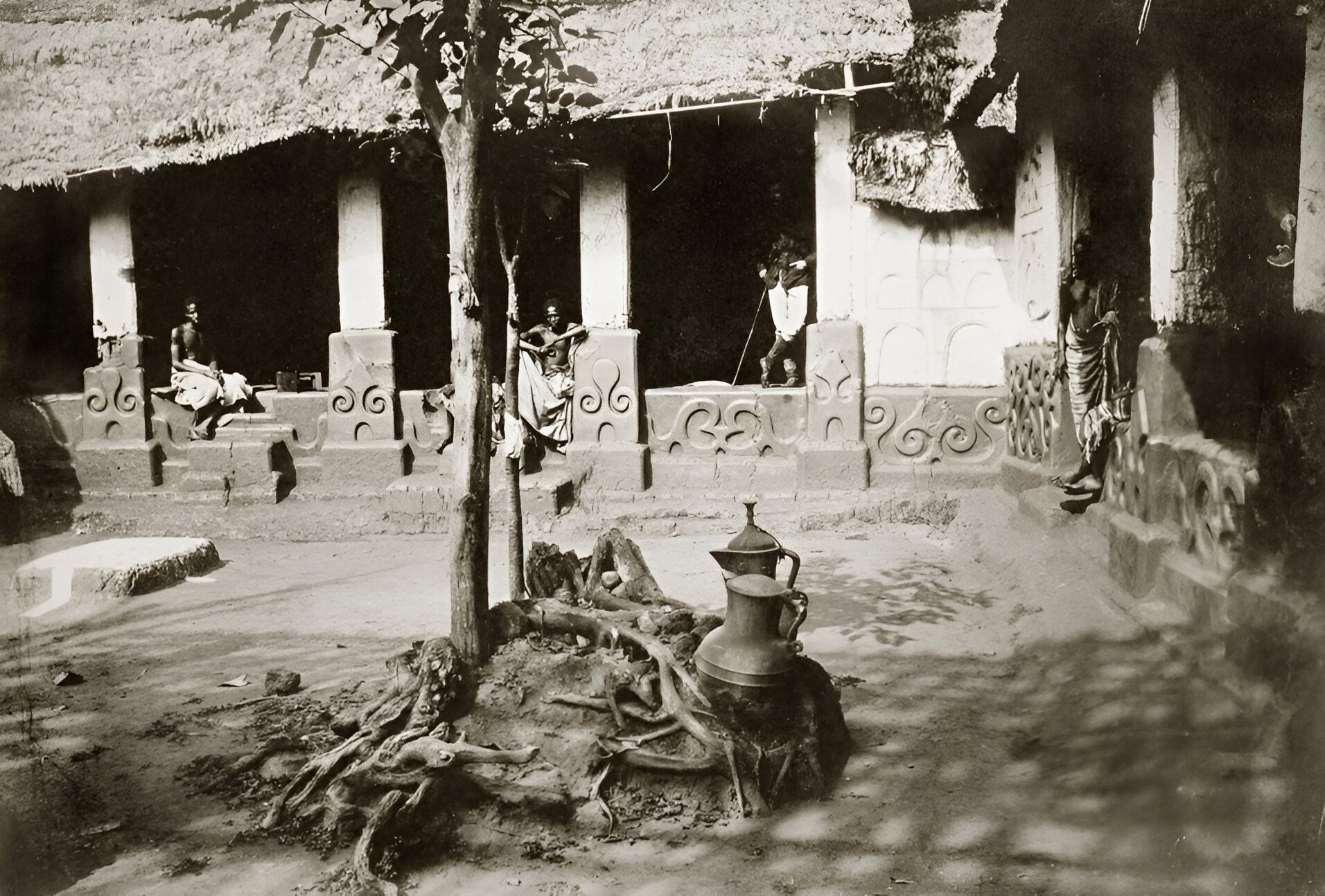 An 1884 photograph of the royal compound in Kumasi in modern-day Ghana shows the Asante Ewer Photograph by Frederick Grant; Credit: Foreign and Commonwealth Office Library