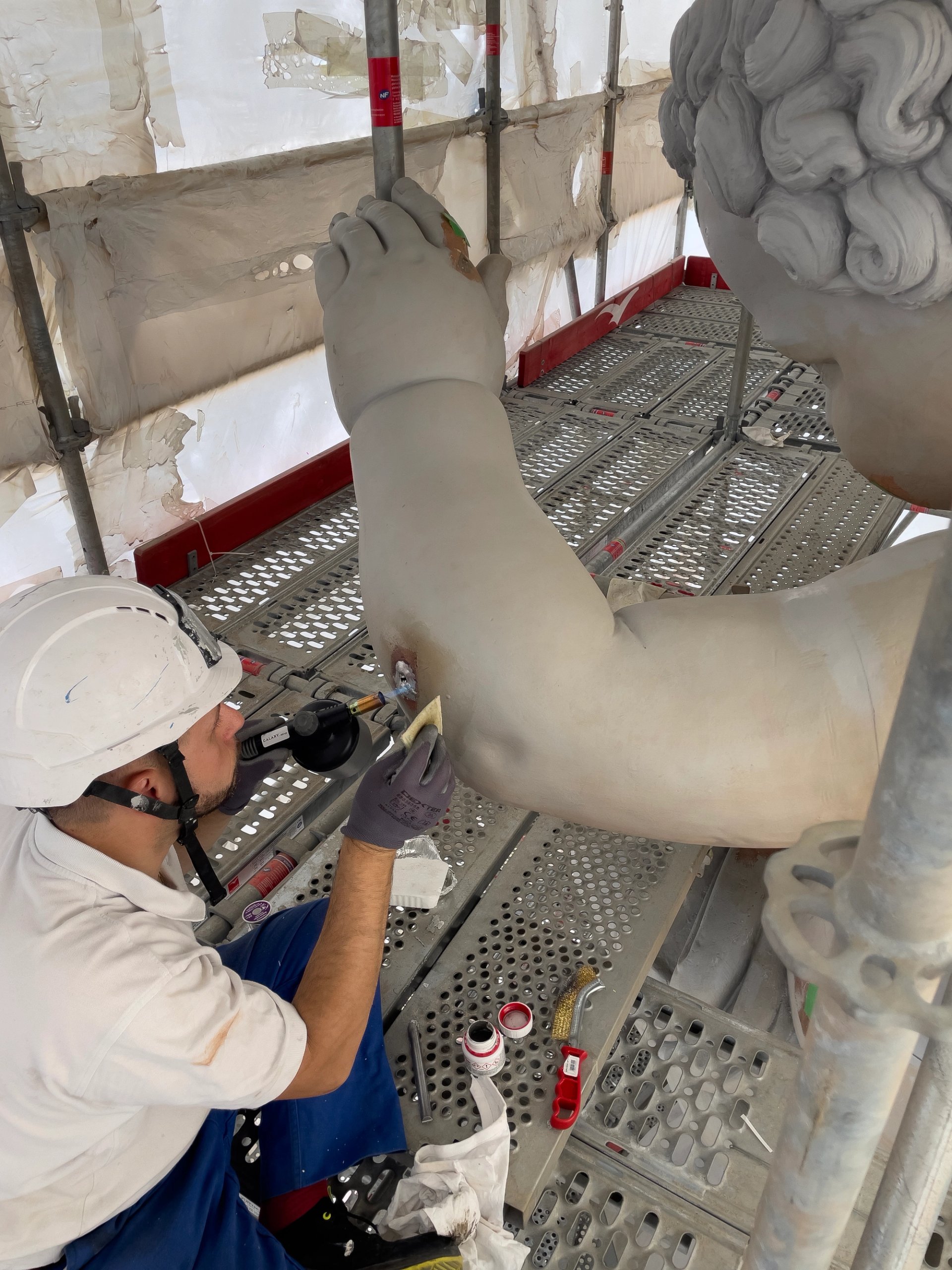 Before this year’s restoration, conservators had never measured the impact of salt on the metal. “To our great surprise, there was three times too much salt on the copper, despite the protective layers of paint and gold,” David says. They therefore encased the statue under a hermetically-sealed and air-conditioned tarpaulin to protect it from winds, pollution and storms.