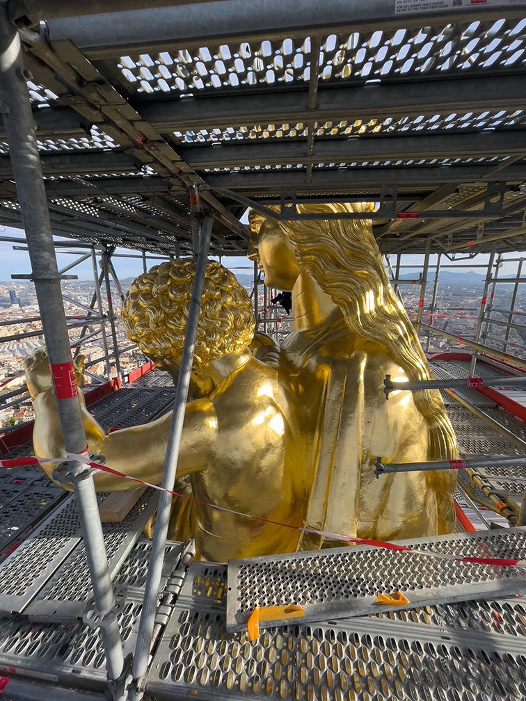 Ahead of the newly gleaming statue’s inauguration on 7 December, its crown was lowered back in place via helicopter, to great applause, in mid-October. Standing on the scaffolding, an official thanked the restoration team for their hard work and extolled the “beautiful future with her [the Madonna]… and, of course,” he said, “you are in the heart of the Bonne Mère, forever.”