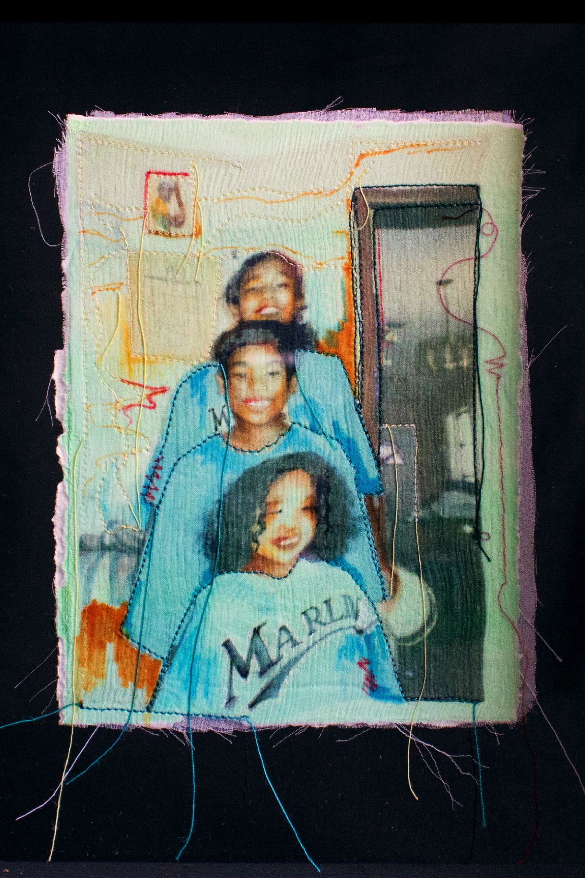 Dyeing fabrics with materials like avocados, cochineal, Spanish moss, indigo and marigolds, Eusebio overlays digital portraits, family photos and landscapes onto fabrics, creating richly textured works that speak to the personal and communal experience of remaking home. While evoking ancestral memory and tradition, Field of Dreams references the unravelling edges of the American dream, baseball—a popular sport in the Dominican Republic and a way of attaining the elusive dream for many migrants to the US—and a new generation of “dreamers” caught between two worlds.