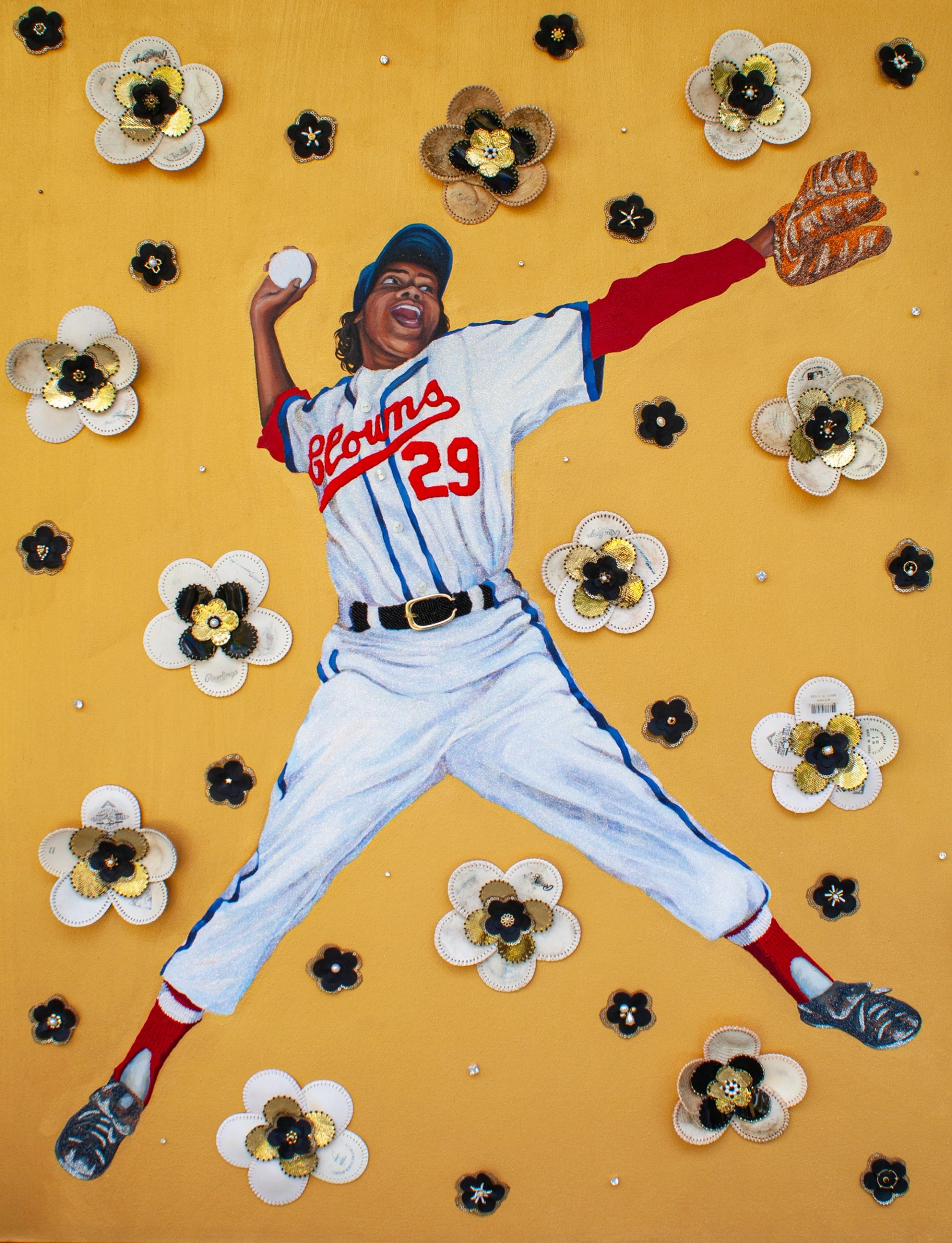 Katrina Majkut’s portrait of baseballer Toni Stone in a “baseball flowers shower” is a home run