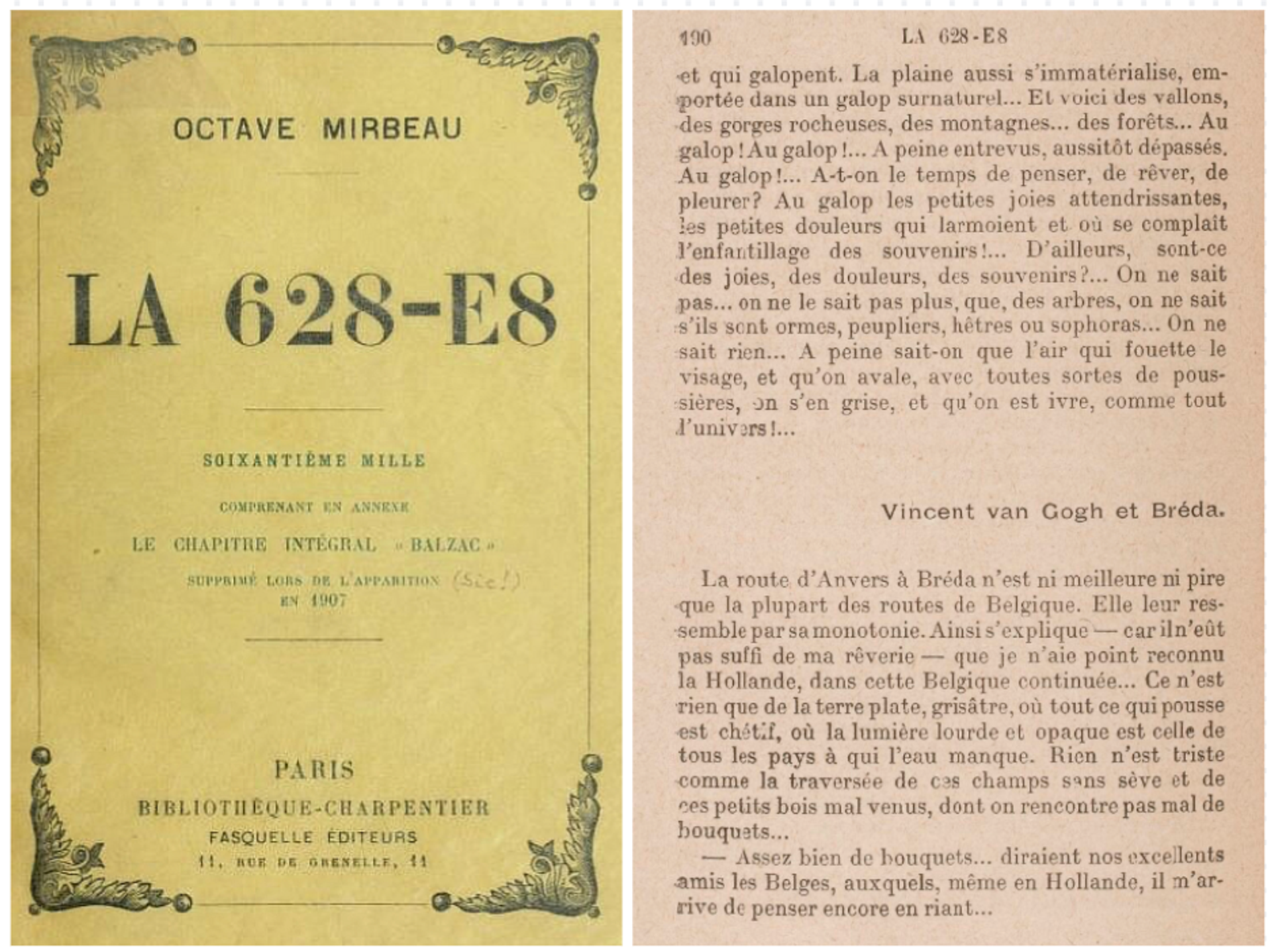 The original edition (1907) of Mirbeau’s La 628-E8, with the title page and the start of the Van Gogh section Published by Charpentier, Paris