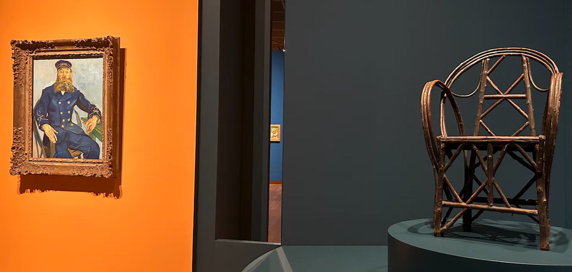 Van Gogh’s Postman Joseph Roulin (August 1888) and the chair on which he sat, presented in Van Gogh and the Roulins: Together Again at Last (Van Gogh Museum, until 11 January 2026) Painting from the Museum of Fine Arts, Boston and chair from the Van Gogh Museum, Amsterdam (photo: The Art Newspaper)