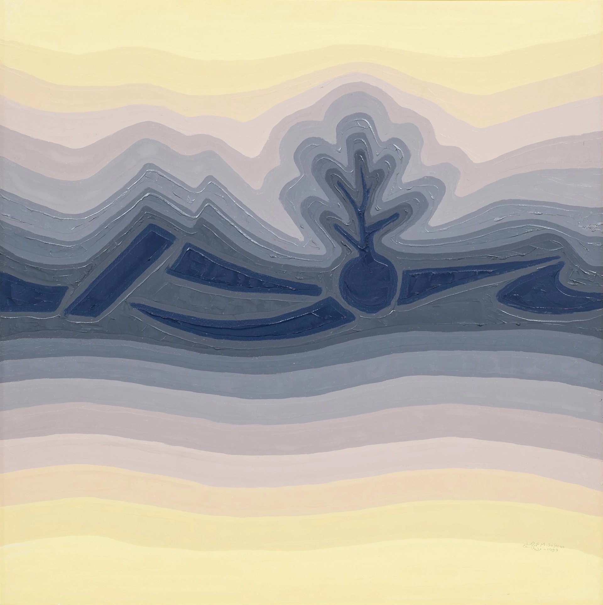 Coffee Shop in Madina Road (1968; est. $150,000-$200,000) by Safeya Binzagr, dubbed the “spiritual mother of contemporary Saudi art”, comes from the collection of Alberto Mestas García, the Ambassador of Spain to the Kingdom of Saudi Arabia from October 1966 to May 1976, and his wife, Mercedes Suárez de Tangil Guzmán. A work by another key Saudi artist, Mohammed Al Saleem, is a prime example of Horizonism, an abstract style inspired by the shifting sands of Riyadh (Untitled, 1989; est. $150,000-$200,000).