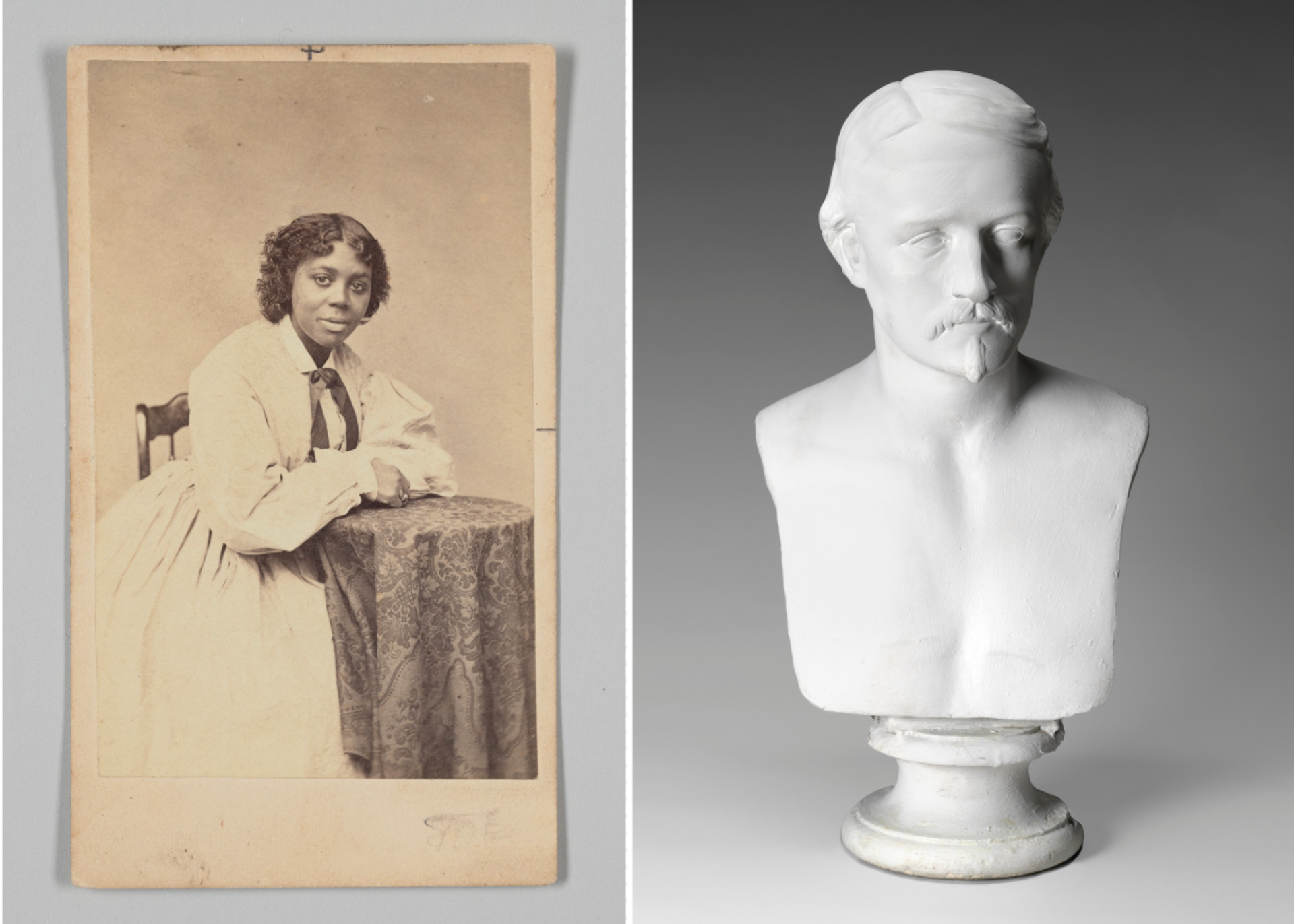 Left: Augustus Marshall’s Portrait of Edmonia Lewis (around 1870), which is in the collection of the Smithsonian National Museum of African American History and Culture; right: Edmonia Lewis’s Bust of Robert Gould Shaw (1864) Left: Collection of the Smithsonian National Museum of African American History and Culture, 2020.10.5; right: Collection of the Massachusetts National Guard Museum and Archives, photo: Stephen Petegorsky.