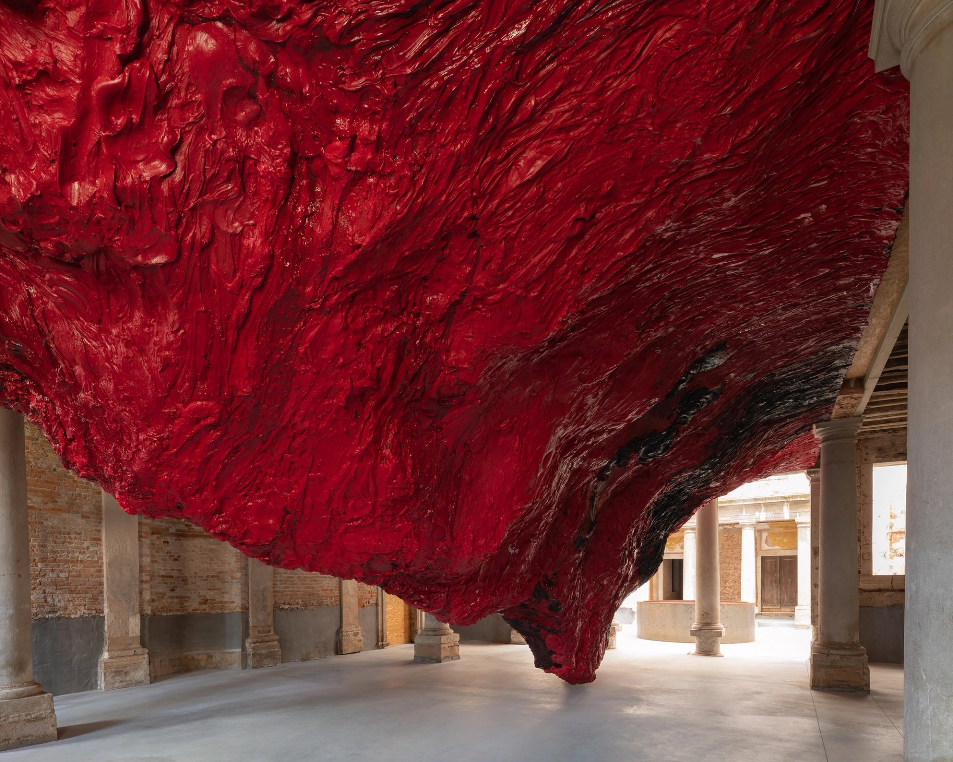 The highlight of the show will undoubtedly be two new as-yet-untitled installations, on a characteristically vast scale. One the gallery describes as “an inflated PVC membrane that fills the six-metre-high space, challenging our sense of scale and self” and the other “a dark mountainous threshold [that] looms down amid a sprawling red landscape”. A third large-scale work, titled Mount Moriah at the Gate of the Ghetto, is more of a known quantity. It’s a giant effusion of blood-coloured wax that was originally placed in the Palazzo Manfrin in 2022, the Venetian building that the artist has owned since 2018 and which houses the Kapoor Foundation.