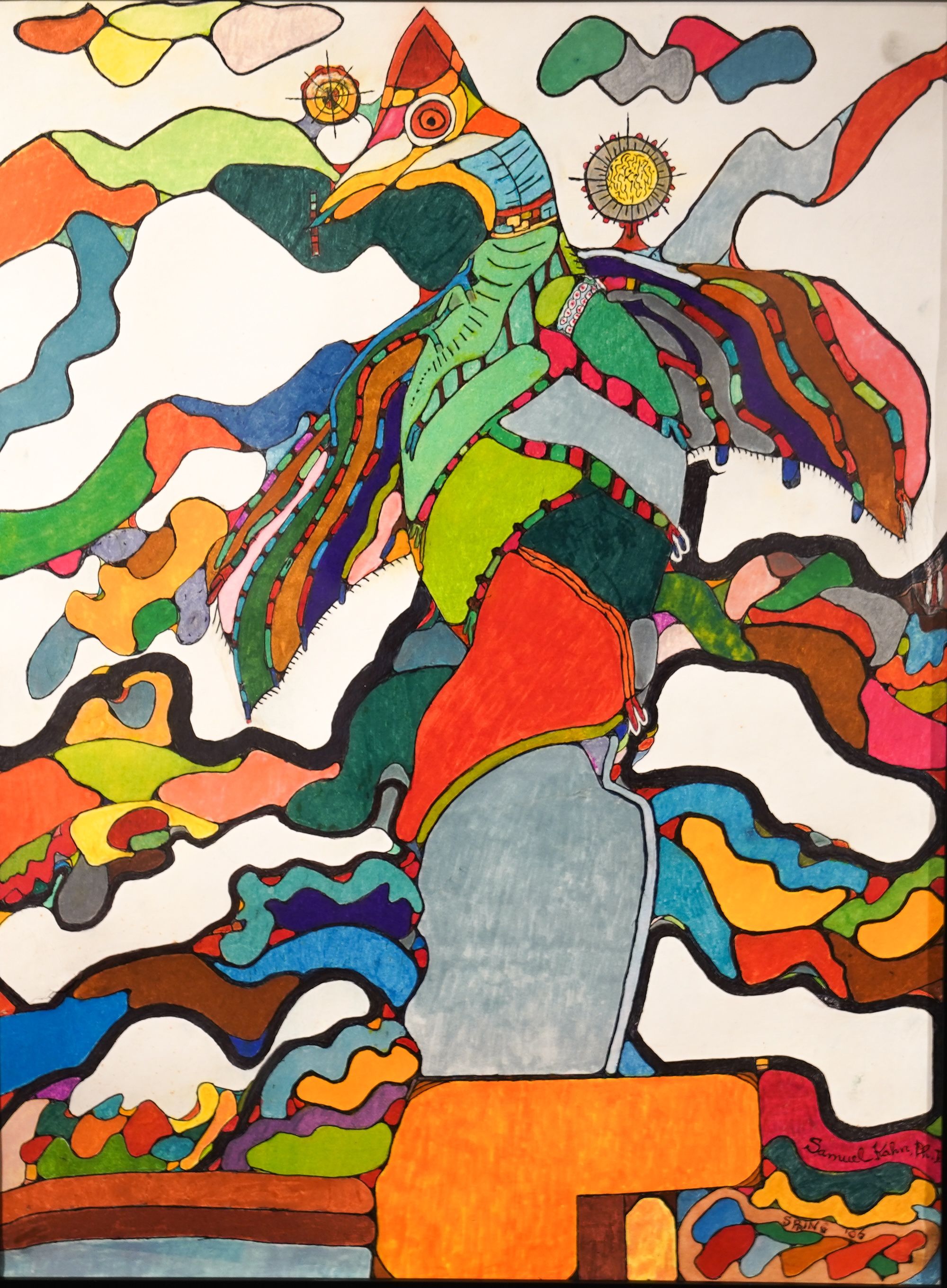 Jasper Waugh-Quasebarth, the show’s curator and the Gordon Art Galleries’ director, describes Dad’s work as radiant, prismatic and “grounded in earthy, natural materials”. Waugh-Quasebarth and other scholars have even compared Sam Kahn to Peter Max, Grandma Moses, Marc Chagall and the Cubists. Dad knew a little about those luminaries, since my mother Renée Kahn was an art teacher, historian and artist in her own right. But Dad emphasised his art-world outsider status by adding “Ph.D.” to his works’ signatures—referring to his Columbia University doctorate in clinical psychology specialising in children, which did him little professional good.