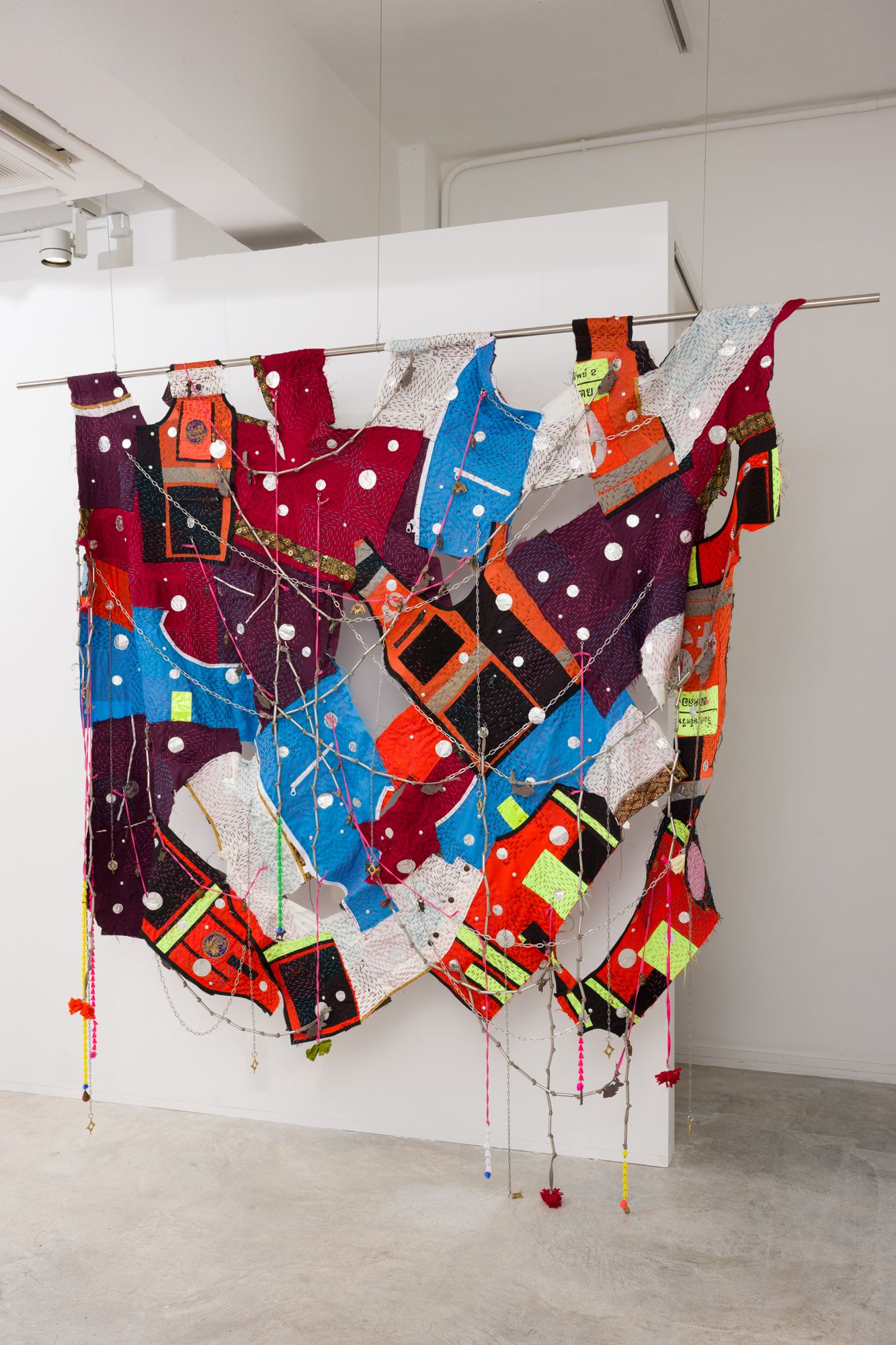 When the Covid-19 pandemic hit, Thailand’s booming tourism industry ground to a halt. As visitor numbers fell, workers in the service industry across the country lost their jobs. While several years have passed, many individuals have yet to recover their livelihoods. When the Thai textile artist Jakkai Siributr learned that one of his studio assistants lived in a community of workers who were struggling, he was moved to help. Siributr purchased their old uniforms to provide financial support. For this work, he deconstructed orange vests from taxi drivers and spa uniforms of masseuses and stitched them together to form a vibrant tapestry. He adorned the work with beads, chains, threads and talismanic objects to symbolise how Thai people visit temples and turn to supernatural powers for healing and protection.