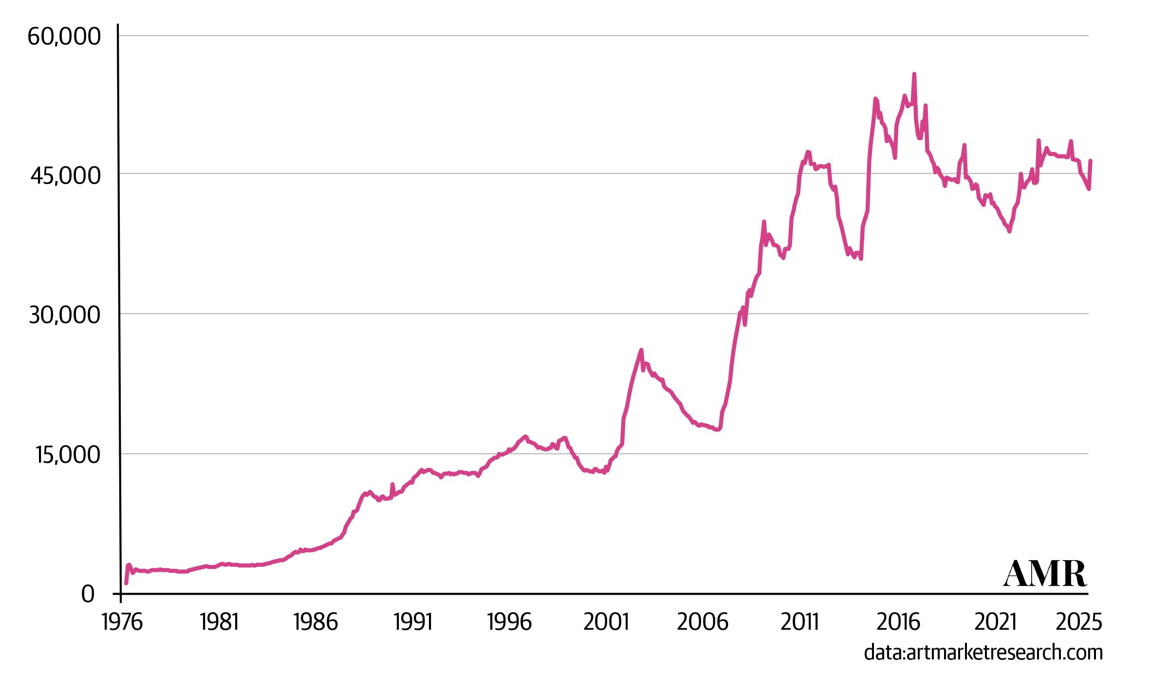 Although Klimt’s drawings are far more numerous than his paintings, their market lags significantly behind. The comparatively lower value and higher volume of drawings sold accounts for the perhaps surprisingly low median value of works sold shown in the graph (pictured below) using data from Art Market Research.