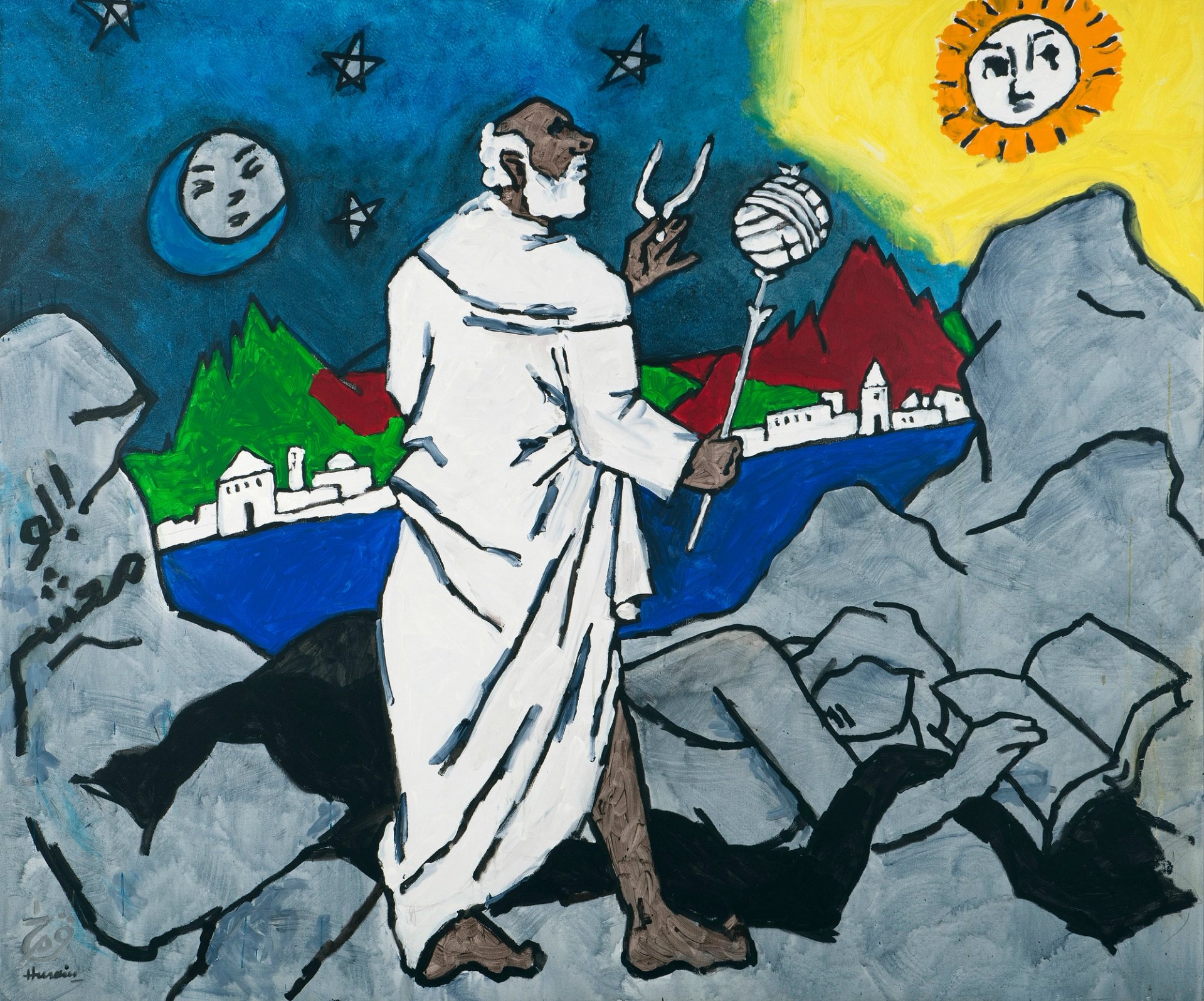 In his final large-scale commission, Husain was asked to create 99 works on different aspects of Arab civilisation; the number was chosen in a nod to the number of names and attributes used to describe Allah in classical Islamic thought. He completed 36 before his death and in one of them, Arab Astronomy, a large but tightly packed canvas, Husain depicts the astrologer Abu Ma’shar, whose shocking white beard recalls Husain himself, walking by the shores of the Persian Gulf below a stylised and almost celestial background. The viewer’s eye, which lingers on the grey boulders of the bay, will find that they are actually made of human form: we can see a reclining woman stretched across the bottom of the painting, her hand on a book in the far-right corner.