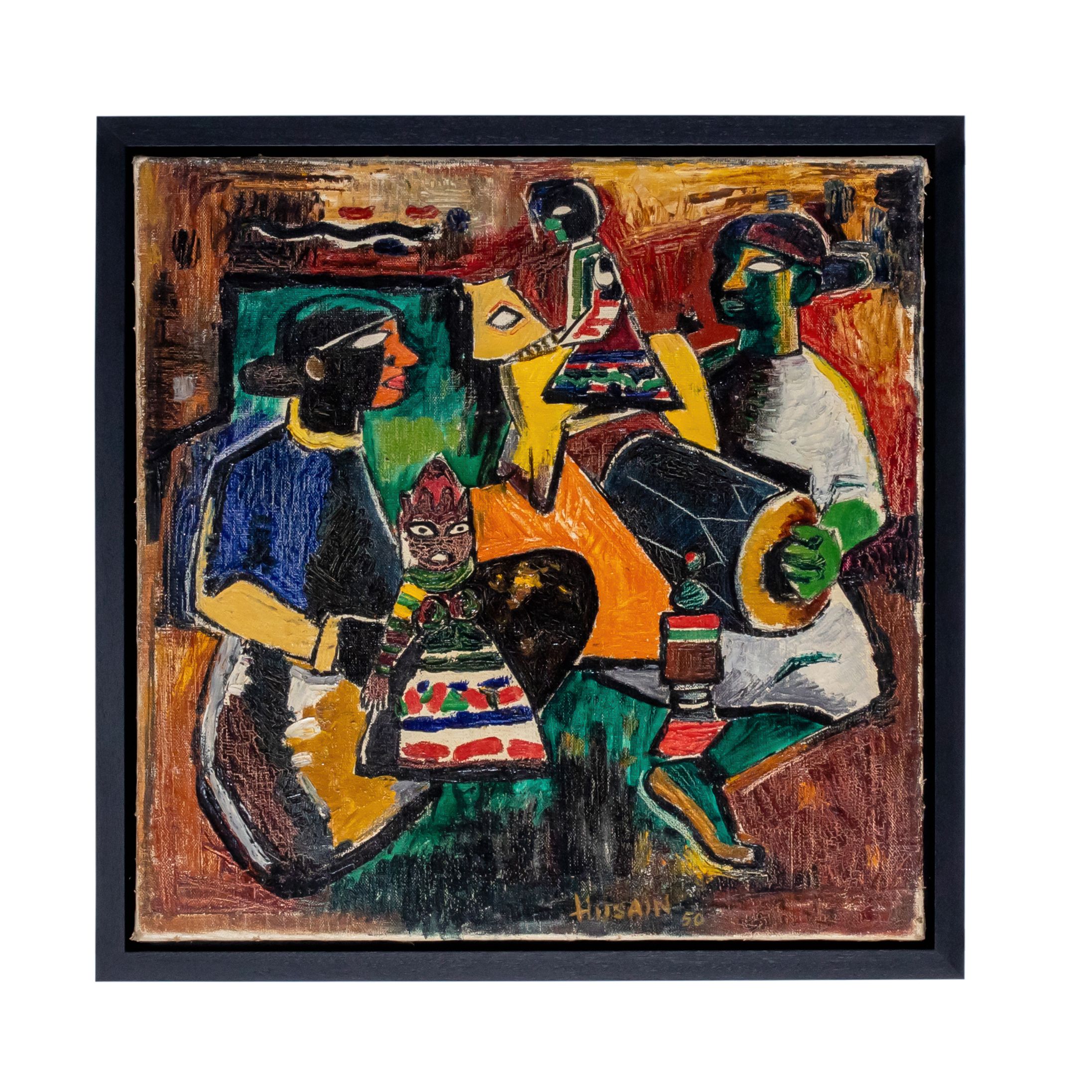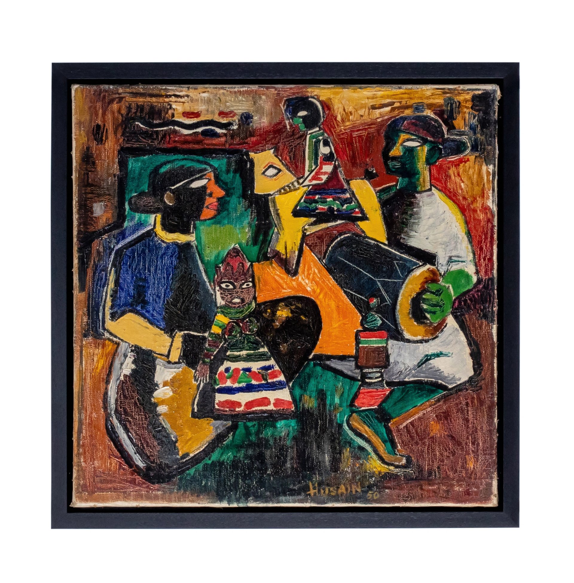 It was perhaps the most original moment of Husain’s career, when he was playing around with what became his signature look: bold black lines enclosing indistinct, shimmering blocks of colour; angular figures arranged with considerable—and meaningful—tension; and the playful assertion of Indian heritage. “There is more power, more freedom” in these works, says Shenoy, who speculates that Doll’s Wedding might bear the influence of movie posters; in the early 1940s, Husain had supported his young family by painting banners and posters for Mumbai’s cinemas. In this piece, much like in a film poster, several stages of action are contained within one tableau.