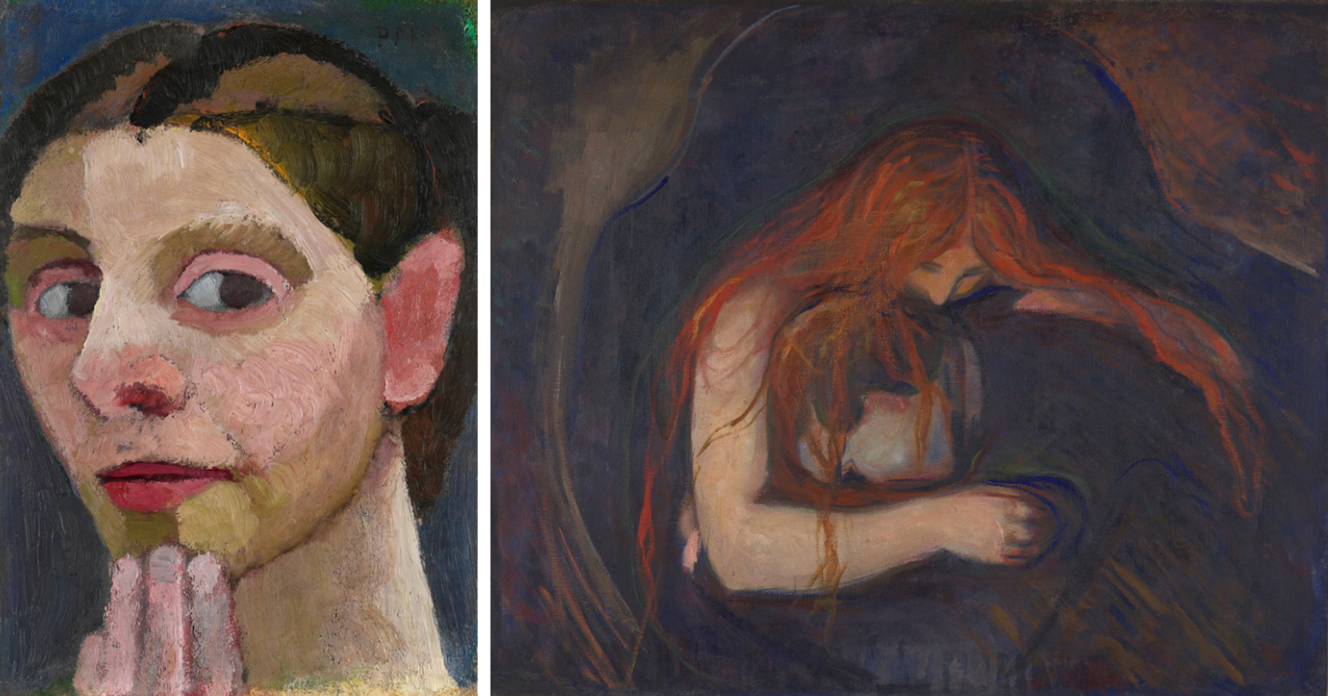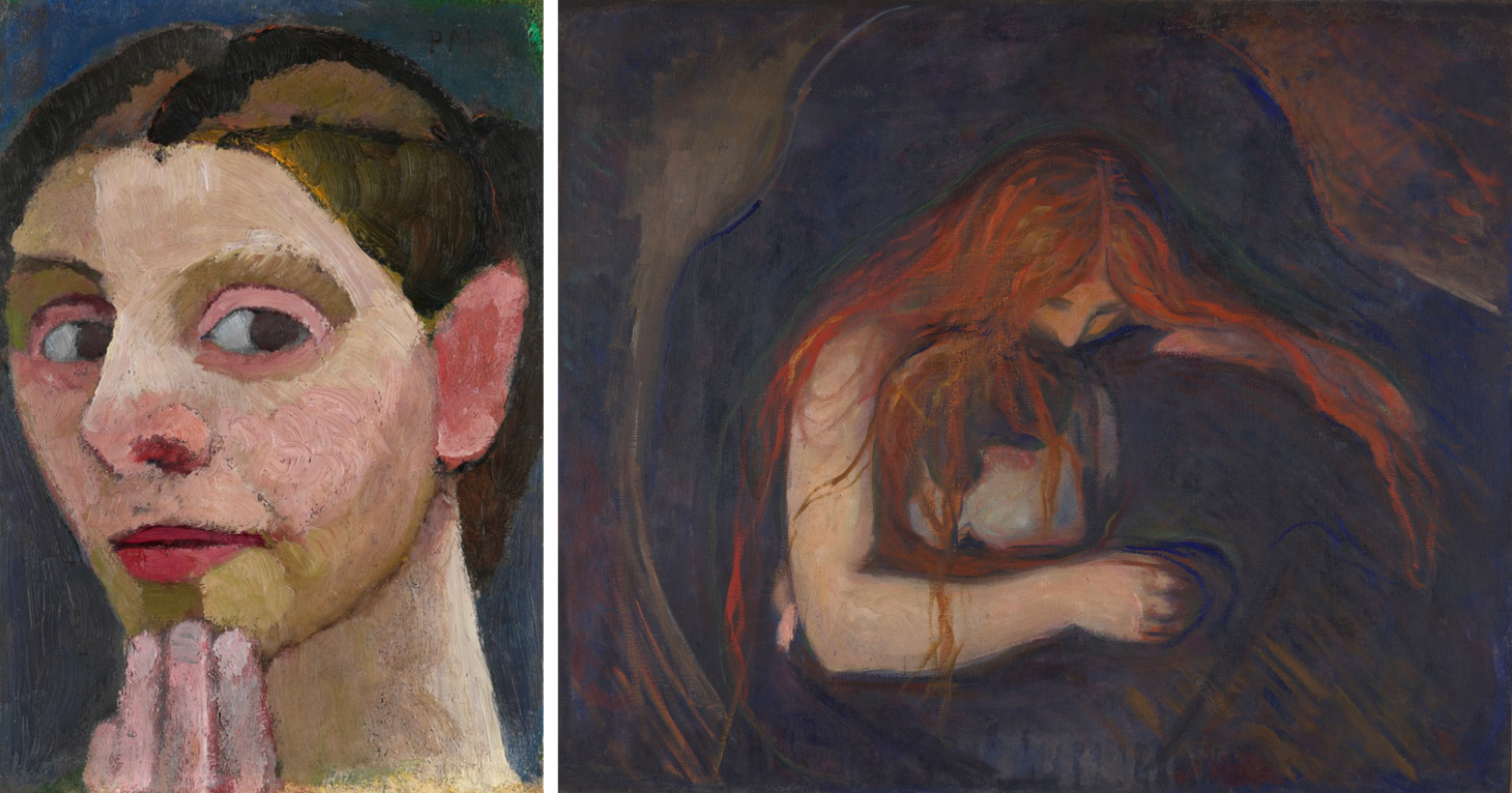 Left: Paula Modersohn-Becker's Selbstbildnis mit Hand am Kinn (1906/07) and right: Edvard Munch's Vampir (1895) Modersohn-Becker: © Landesmuseum Hannover/ARTOTHEK; Munch: © Munchmuseet, Oslo