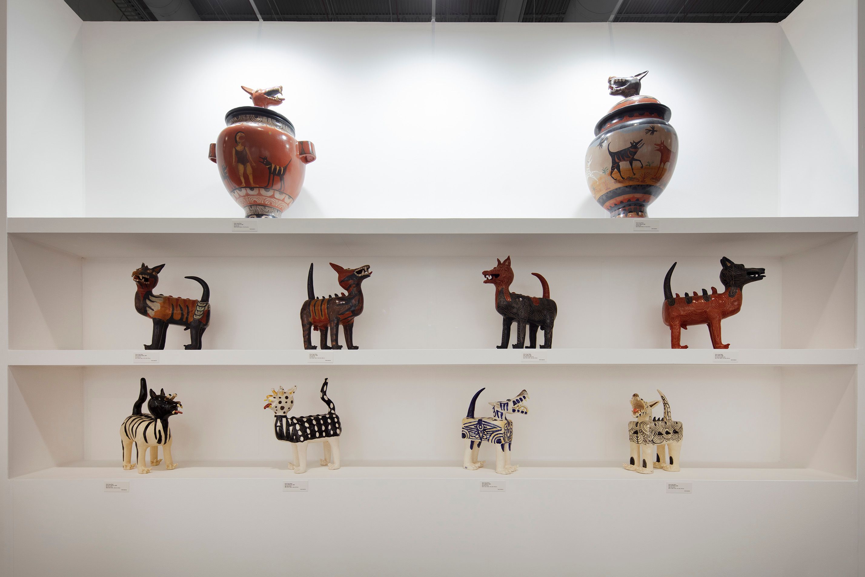 The Proyectos Monclova stand includes, among other works, a series of dystopian, science-fiction tinged paintings by the Havana-based artist Brenda Cabrera, intricate gouache and pencil compositions on wood by the Mexico City-born artist Circe Irasema and a wall of ceramic sculptures by the Guadalajara-based artist Víctor Hugo Pérez. “Victor has been working with traditional ceramic processes from Guadalajara that are disappearing,” Cohen says. The sculptures, contemporary reinterpretations of pre-Hispanic vases and figures of dogs and cats, are priced between $3,000 and $6,000.