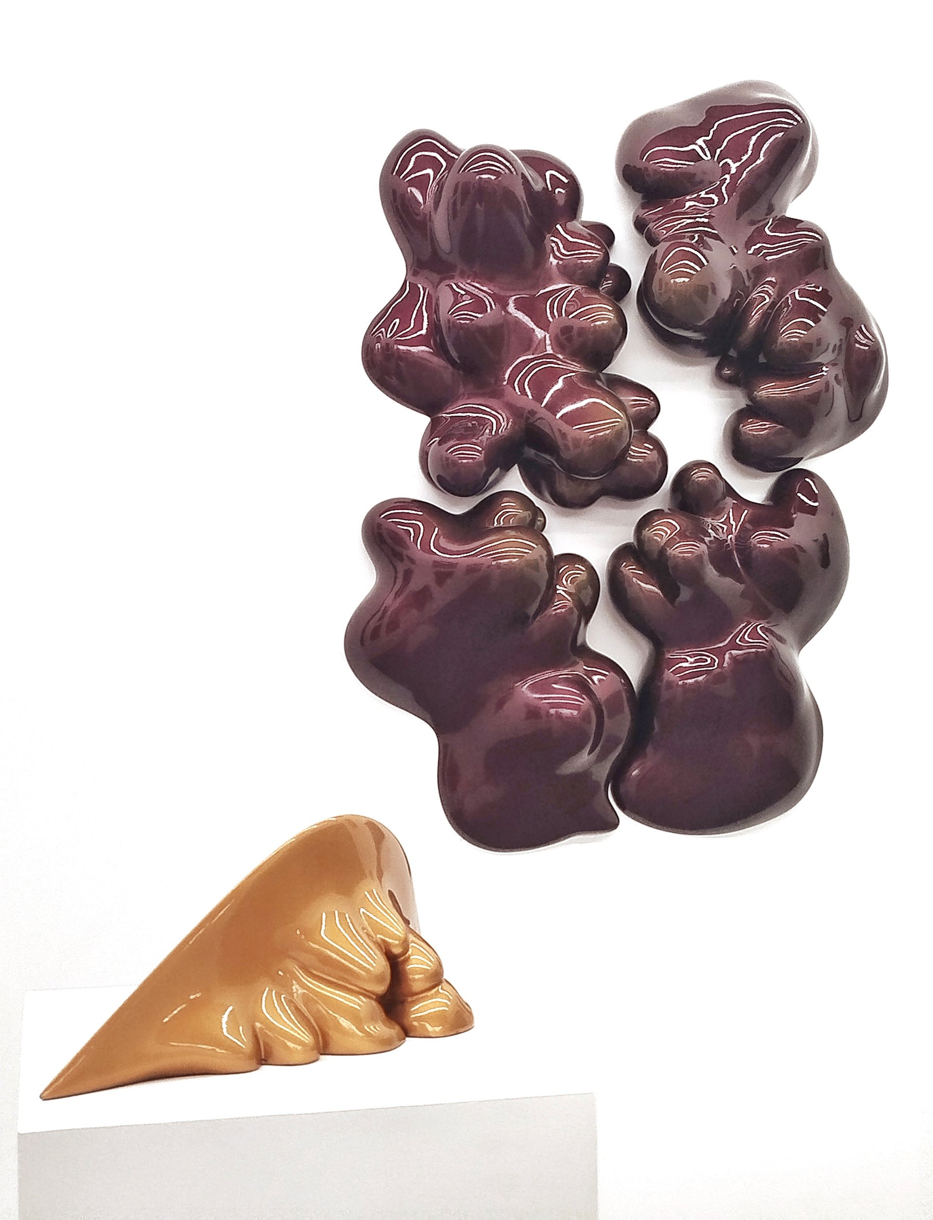 The Argentine artist Miguel Harte, meanwhile, envisions a natural environment thoroughly overwhelmed and transformed by synthetic materials in his works on the stand. They feature exquisite surfaces of opalescent enamel and polyester resin that are interrupted by abscesses, growths and orifices, or seem to have sprouted bulbous pockets enclosing small natural dioramas. The works meld the glossy aesthetics of Finish Fetish artists like Billy Al Bengston with the abject grotesques of Paul Thek.