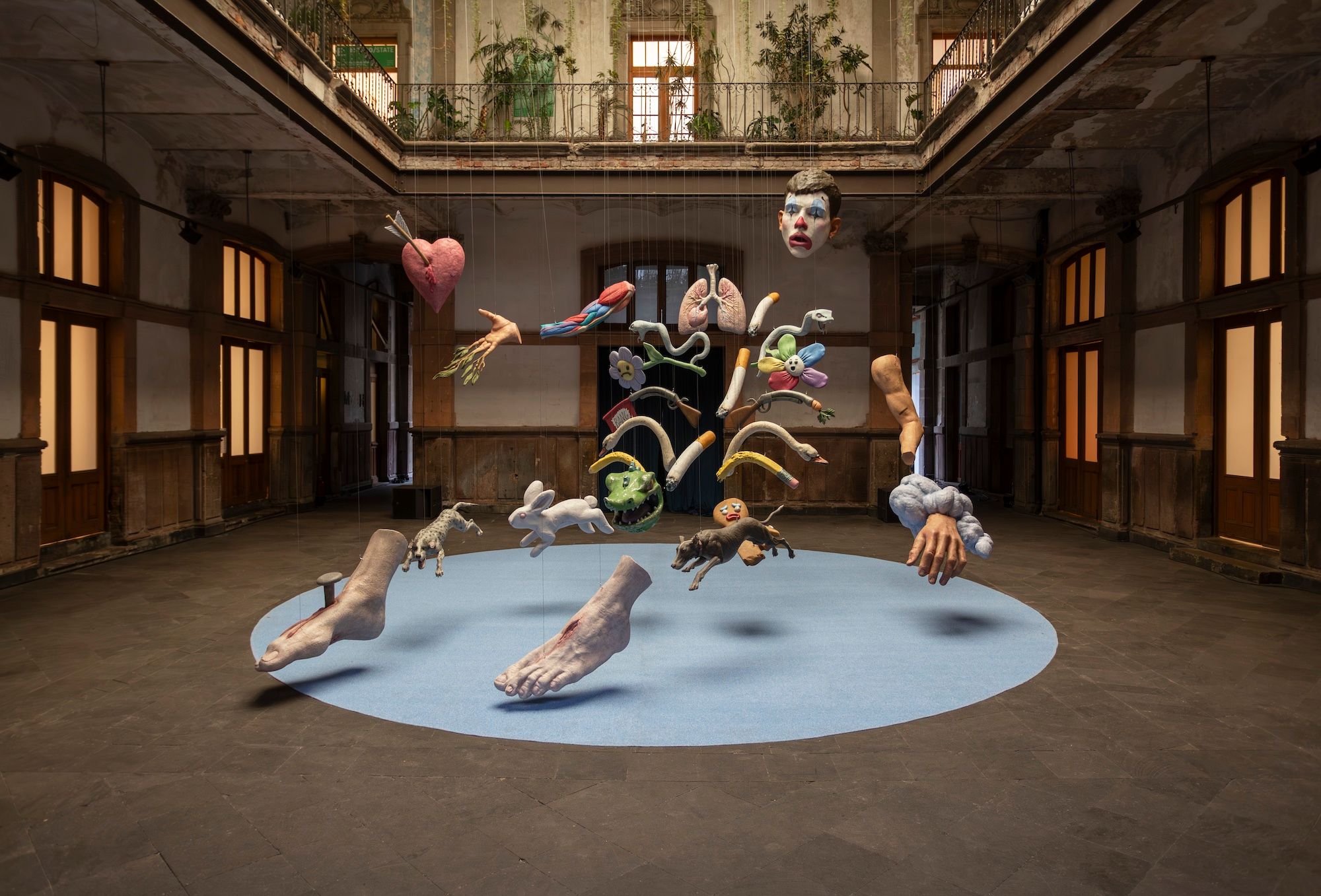 Salón Acme is itself a kind of path to abundance, with art tucked into most available spaces in its photogenically dilapidated colonial-era mansion venue. The showstopping installation by the Mexican artist Enrique López Llamas in its main atrium, I Am the Resurrection and I Am the Life (2026), is a playful, monumental riff on art historical depictions of the crucified Christ. The suspended, deconstructed figure includes a spine made of giant cigarettes, pouncing dogs for legs and a face made up like a harlequin. The fair’s State sector, devoted to a different region of Mexico each year, is spotlighting artists from and based in the country’s fourth-largest city, Puebla, and curated by Nina Fiocco.