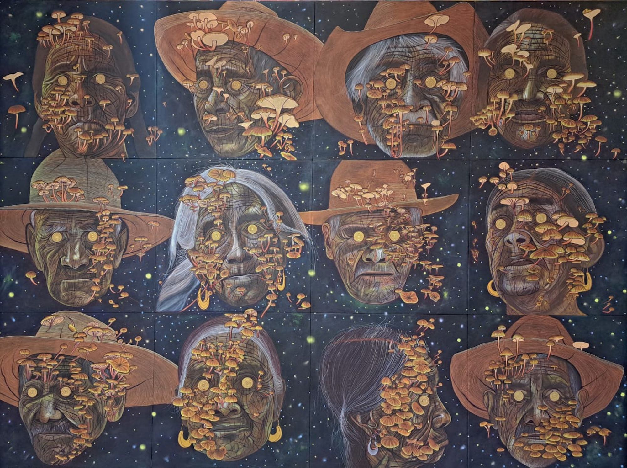 Nearby, the stand of the influential Mexico City gallery Llano is anchored by two large works on canvas depicting responses to environmental and political crises. The Hidalgo-born artist and film-maker Tania Ximena created the large diptych El Bosque I y II (2025) based on her research in a coastal region of Mexico where communities have been displaced repeatedly due to drought and flooding. Her landscapes of red, green and orange are punctuated by white tree trunks, a reference to the saltwater infiltration that is killing off the region’s vegetation. The 12-panel painting at the centre of the stand is Consejo Mayor (2024) by Giovanni Fabián Guerrero, an artist from the self-governing community of Cherán in Mexico’s Michoacán de Ocampo state. It depicts members of the community's council of elders overlaid with medicinal mushrooms used in the region.