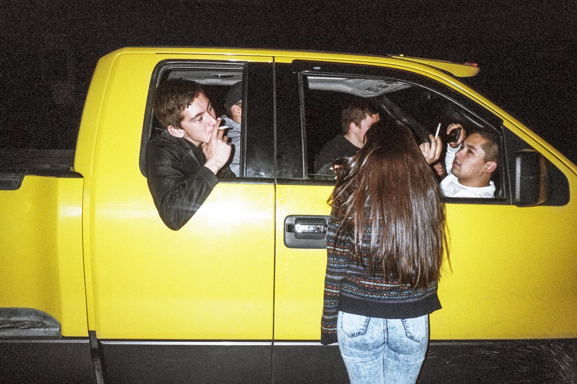 These words carry particular potency from Storch, given that everyday life is the bread and butter of his artistic practice. His intimate, understated photographs capture the daily traditions and interactions of contemporary Greenlanders, each image a masterclass in composition and layering. In the series Keepers of the Ocean (2019), for example—primarily taken in Storch’s hometown of Sisimiut, the second largest city of Greenland, population 5,526—young people (Storch included) hang out and smoke; and an older woman bows her head as she walks, Greenland’s flag flapping behind her.