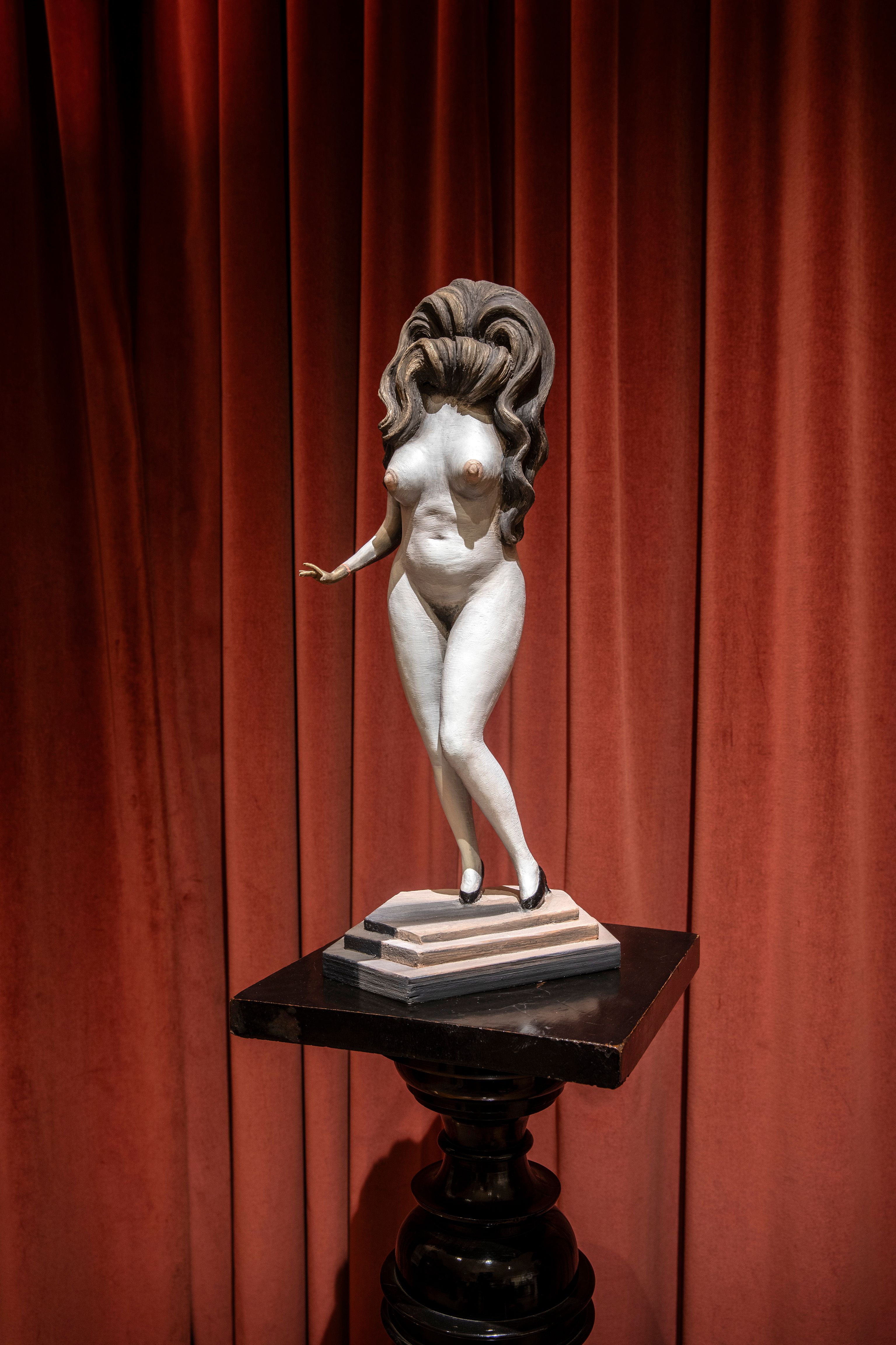 Amid the objects in Freud’s study it is initially hard to spot Pilkington’s sculptural interlopers. Peeping out from among the figurines on the desk is a polychrome statuette of a multi-breasted goddess with long white socks and dainty red shoes, while on a mahogany plinth previously occupied by a Roman bust, another miniature naked figurine strikes a pose in racy stilettos. A horse’s head and a faceless fur-collared female bust appear on a tabletop and disembodied plaster limbs nestle on folded blankets.