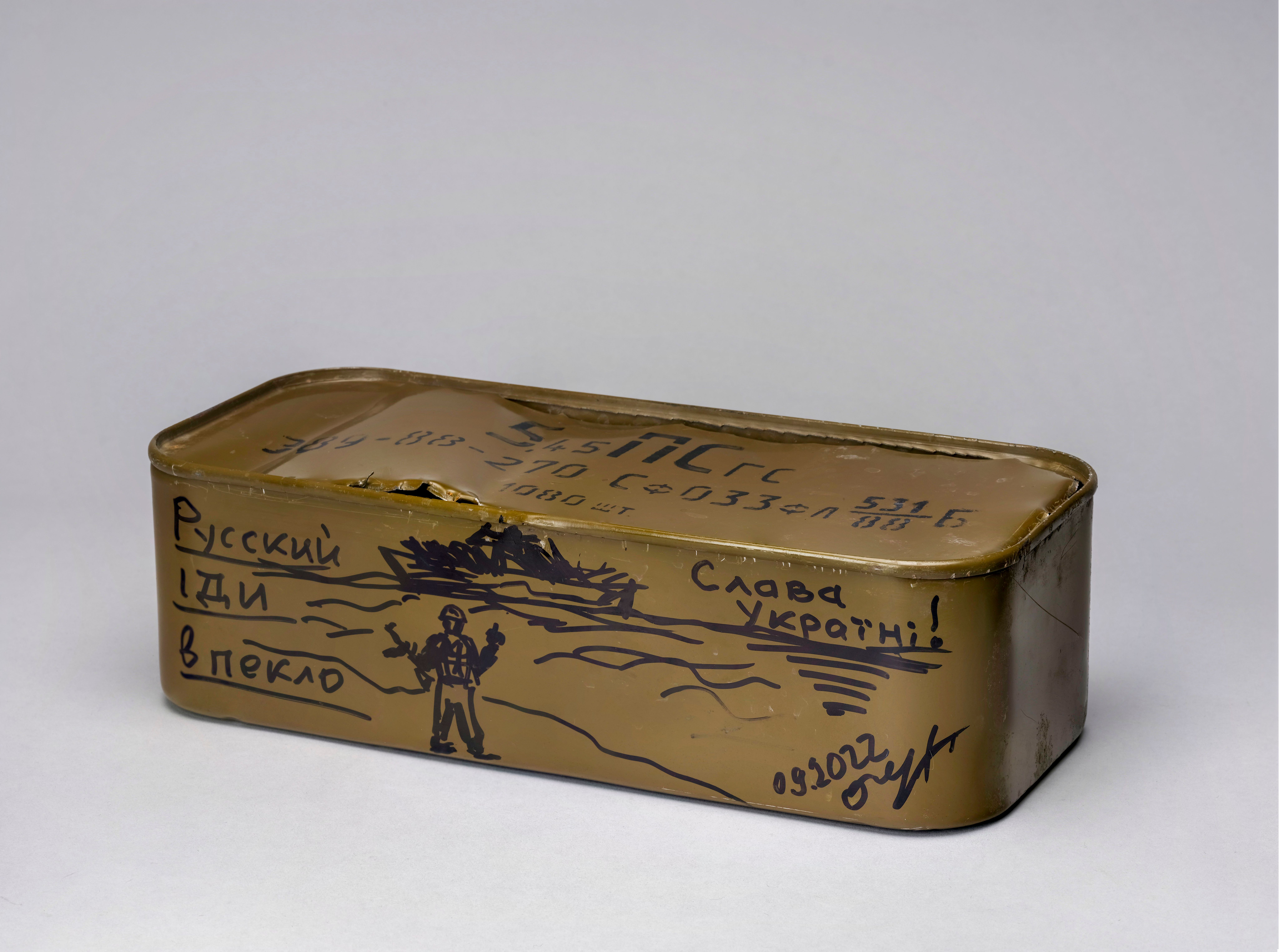 A Ukraininan ammunition tin, decorated with images and text on two sides using Sharpie pen, September 2022 Photo: © The Fitzwilliam Museum, University of Cambridge