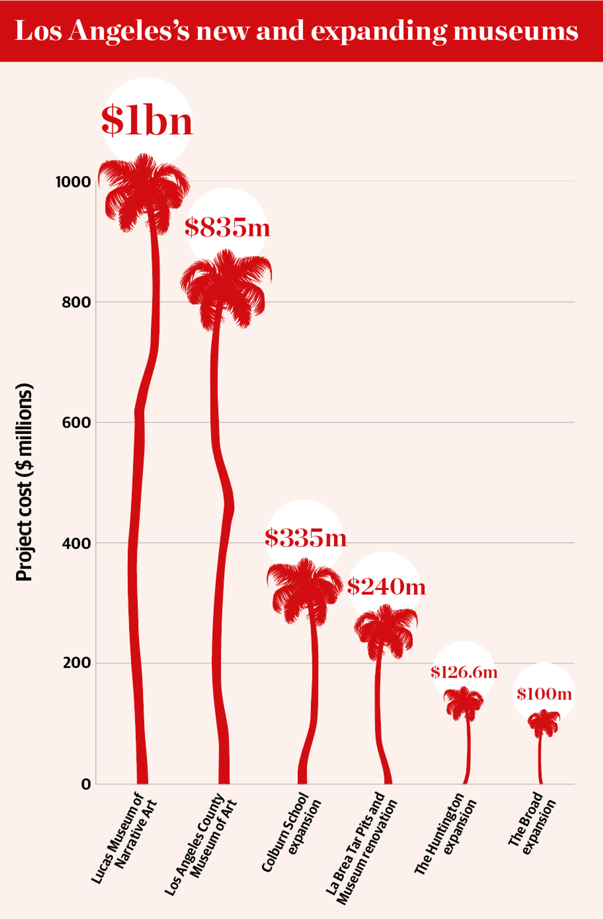Others, like the philanthropist Nicolas Berggruen, who is building a new headquarters for his Berggruen Institute in the Santa Monica Mountains—designed by the architects Herzog & de Meuron and funded by a $500m endowment—see all the additions to the city’s cultural scene as clear signs of its dynamism. “Los Angeles is lucky to have an enormous pool of artists and talent,” Berggruen says. “With the new Lacma and the Lucas Museum, it will continue to grow as a cultural centre, allowing not only the creation of objects but their display and broad interaction with the public. This increases Los Angeles’s appeal as a cultural magnet.”