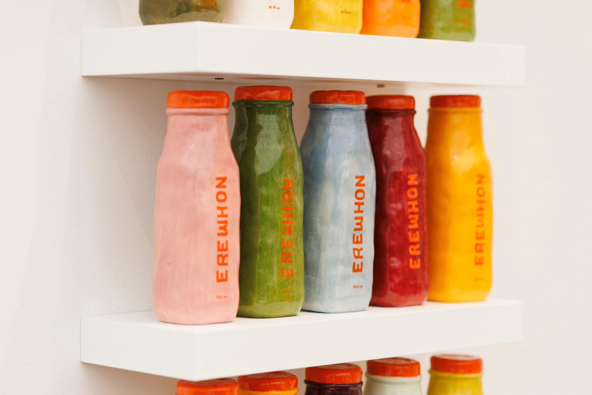 Erewhon’s cold-pressed, glass-bottled organic juices can seem like the ultimate bougie accessory in Los Angeles—a must-have for all the Alo-clad yoga moms running errands in Brentwood. And yet these juices are also delicious and heartening. (We are partial to their Heavenly blend of Granny Smith apple, cucumber, pineapple, kiwi, spinach and broccoli.) Now, in a gently questioning sort of homage, the Brooklyn-based artist Stephanie H. Shih, known for replicating dumplings and other Asian comfort foods, has made beautiful painted ceramic knock-offs of Erewhon’s juice line, complete with their recognisable orange caps.