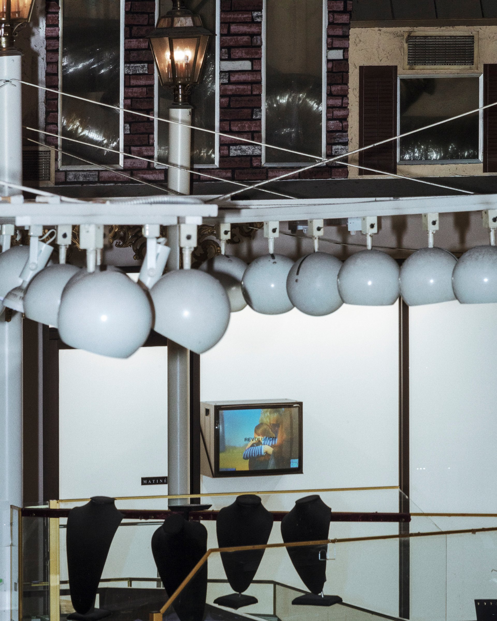 The artist Andrew J. Greene took the corner offices—former site of the televangelist’s stage—and opened Matinée in November 2025 with a presentation of videos made by Gretchen Bender (1951-2004) between 1986 and 1991. This was the first in a series of exhibitions in Greene’s two-year-long programme focusing on work made in the 1980s and 90s—a time when the Cold War, the ascendancy of neoliberalism and the culture wars “reflected deep currents of collective anxiety through materialist practices”, according to the gallery’s opening statement. Artists today, it continues, can see how this period offers important instruction in how political stakes and historical realities can meaningfully shape new aesthetic paradigms.