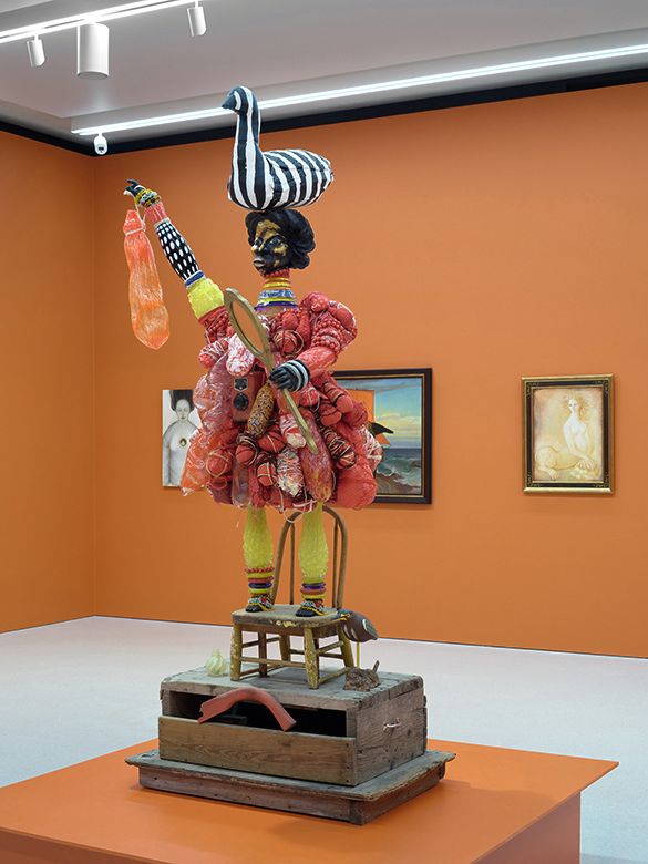 Women enjoying their own bodies takes a metaphysical turn in the “Surrealist Self” gallery with Anna Güntner’s enigmatic Shy Fiancé (1961) and Leonor Fini’s Sphinx (1973), both portraying bare-breasted women as totems of mystical powers, alongside Vanessa German’s figurative sculpture The Blood & The Animals, The Mirror & The Sky; An Ode to the Un-Language-Able Truth of Is-Ness (2017), constructed from found objects and, according to the artist, “the blood that binds us all together, light, light, light, glee, the glory of creativity, the deep truth that we are all here together”. This halfway mark in the show offered a necessary uplifting, poetic pause—though this critic does feel most at home in the surreal.