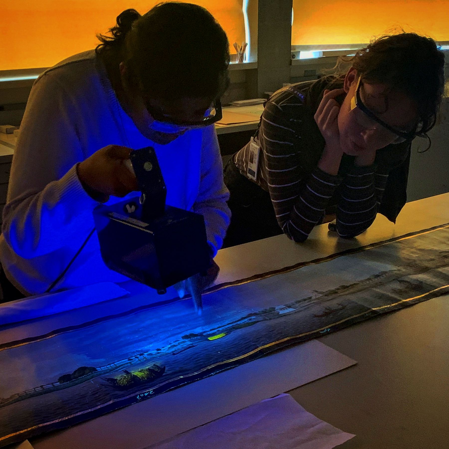 Anita Dey, the assistant paper conservator at the Yale Center For British Art, and Emma Hartman, the assistant conservator of paper at Yale University Art Gallery, examining the Lucknow Scroll under ultraviolet light. Photo: Jessica Makin, image courtesy of the Yale Center for British Art