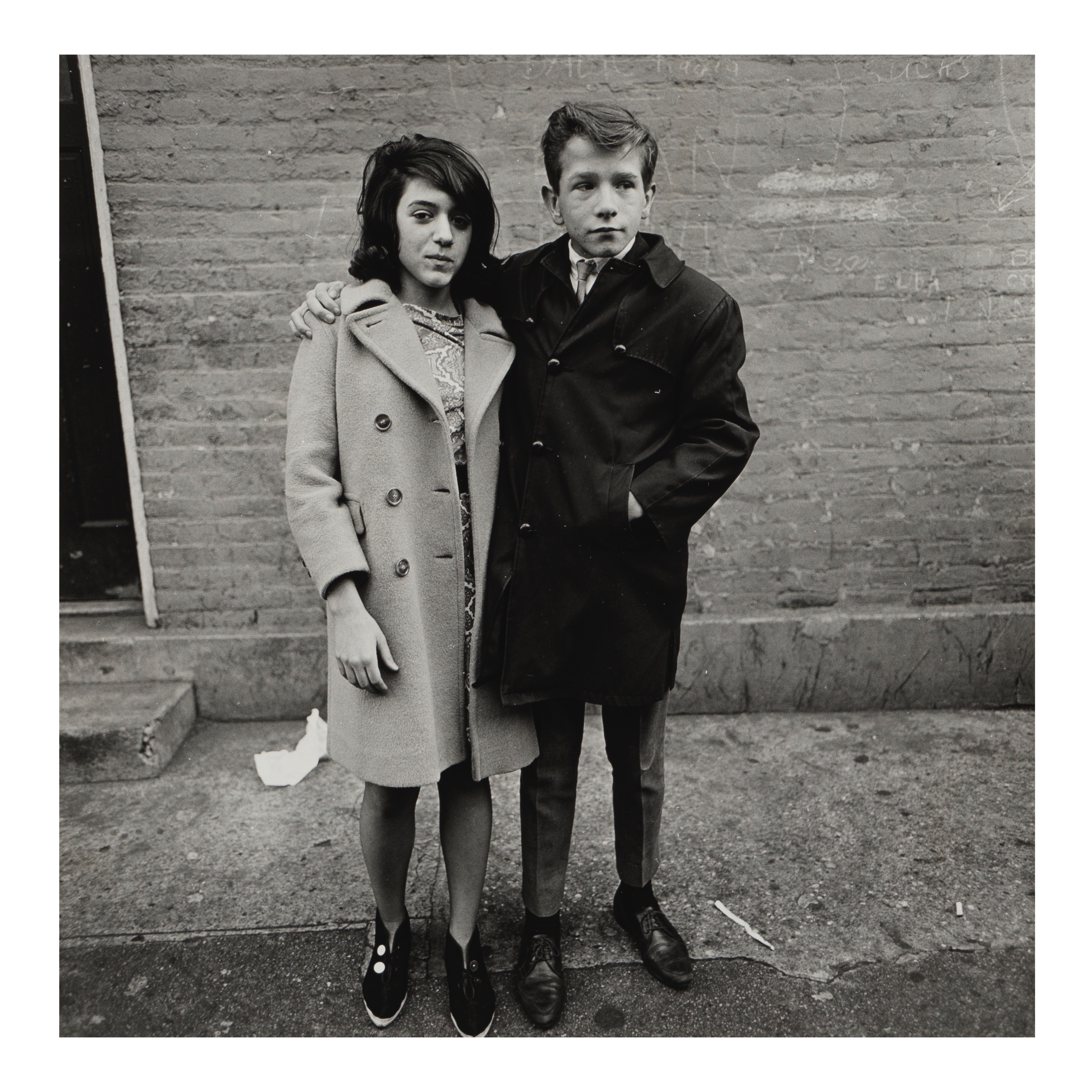 During the 1963 holiday season, the photographer Diane Arbus made this portrait of a young couple at Hudson and West 10th streets, near her own home on Charles Street in Greenwich Village. Typical of her practice at this time, she would often station herself in a public area—Washington Square Park and Central Park were among her favourites—so she could observe the wide variety of people moving through the city.